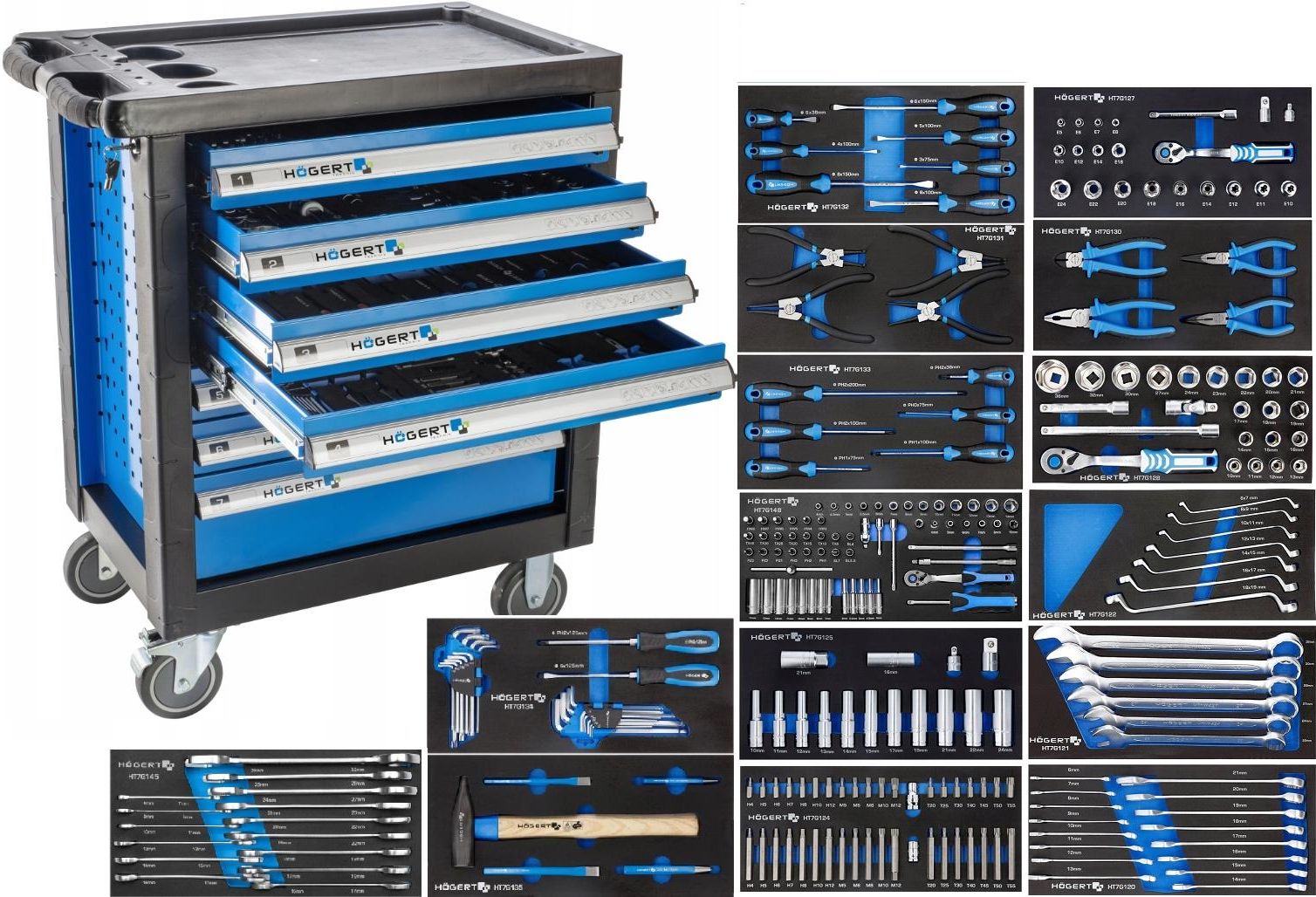 HOGERT SZAFKA WARSZTATOWA HT7G058 Cechy produktu: Praktyczna szafka narzędziowa z 7 szufladami do przechowywania narzędzi i akcesoriów. Prowadnice szuflad z mechanizmem wykonane z wysokogatunkowych materiałów. Blokada zabezpieczająca przed samoczynnym wysunięciem szuflady. Kółka z PCV w rozmiarze 5x1.25” z łożyskami kulkowymi. Możliwość zablokowania szafki przed przesuwaniem. Zamknięcie szafki na klucz, w zestawie 2 kluczyki. Wzmocniony blat z tworzywa ABS  Perforowane ścianki umożliwiające użycie dodatkowych akcesoriów wyposażenia. Dowolność konfiguracji szafki narzędziowej (wkłady EVA). Ochrona narożników zapobiegająca wstrząsom (minimalizuje ryzyko uszkodzeń). Dwa koła skrętne pozwalające na swobodne przemieszczanie wózka. Wymiary: 760x460x910 mm W skład kompletu wchodzi: Wkład HT7G047 Szafka warsztatowa 7 szuflad Wkład HT7G120 Zestaw kluczy płasko-oczkowych 16 szt., wkład EVA Wkład HT7G121 Zestaw kluczy płasko-oczkowych 6 szt., wkład EVA Wkład HT7G122 Zestaw kluczy oczkowych 7 szt., wkład EVA Wkład HT7G124 Zestaw końcówek wkrętakowych 40 szt., wkład EVA Wkład HT7G125 Zestaw nasadek z adapterami 14 szt., wkład EVA Wkład HT7G127 Zestaw narzędzi z grzechotką 3/8", 22 szt., wkład EVA Wkład HT7G128 Zestaw narzędzi z grzechotką 1/2", 23 szt., wkład EVA Wkład HT7G130 Zestaw szczypiec 4 szt., wkład EVA Wkład HT7G132 Zestaw wkrętaków płaskich 7 szt., wkład EVA Wkład HT7G133 Zestaw wkrętaków PH 6 szt., wkład EVA Wkład HT7G134 Zestaw wkrętaków, kluczy HEX i TORX 20 szt., wkład EVA Wkład HT7G148 Zestaw narzędzi z grzechotką 1/4 63 szt Wkład HT7G131 Wkład zestaw szczypiec segera 4el Wkład HT7G135 Wkład zestaw młotek + przecinaki 5el. Wkład HT7G145 Zestaw kłuczy płaskich 15szt. 6-32mm