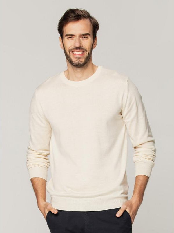 Sweter męski Willsoor Kolor: kremowy Dekolt: okrągły (typ O-neck) Skład: 50% bawełna, 50% akryl Rękawy wykończone ściągaczem Dół wykończony ściągaczem Elastyczna tkanina, prosty fason Jakość: pierwsza Gwarancja: 24 m-ce