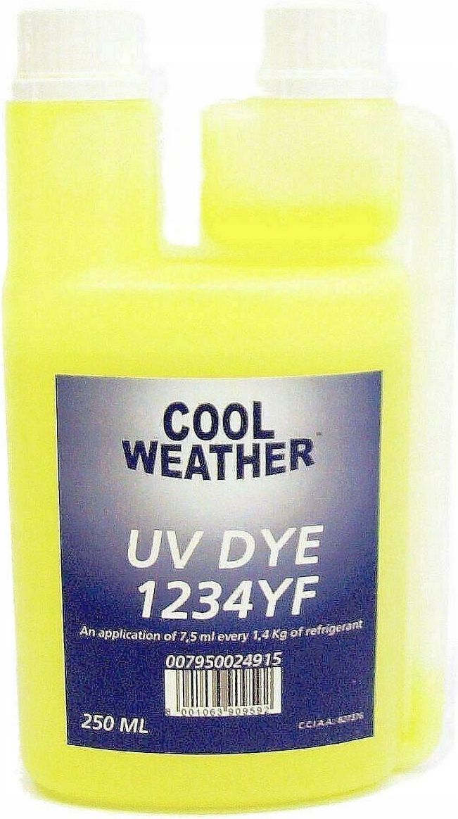 Powyższy produkt to barwnik UV, który jest mieszaniną skondensowanej cieczy fluorescencyjnej, którą można zobaczyć w ultrafiolecie i zwykle w oleju typu PAG do użytku w układach klimatyzacji. W celu prawidłowego stosowania środka UV trzeba podać barwnik do części wewnętrznej klimatyzacji samochodowej w celu wymieszania oleju z czynnikiem znajdującym się w przewodach. Następnie należy zastosować lampę ultrafioletową w celu zlokalizowania nieszczelności w układzie klimatyzacji. Jeśli kontrast wycieka nawet w niewielkiej ilości, oznacza to, że układ jest nieszczelny i dzięki światłu ultrafioletowemu jest to od razu zauważalne. Ten sposób lokalizowania nieszczelności jest obecnie najpopularniejszym i najlepszym sposobem na wykrycie nieszczelnego układu klimatyzacji i zlokalizowanie wycieku. Barwnik UV jest substancją fluorescencyjną o zabarwieniu żółtym. Jest to produkt całkowicie bezpieczny dla urządzenia klimatyzacyjnego co zapewnia bezpieczne użytkowanie i lokalizowanie przecieków. Dozowanie następuje poprzez wymieszanie z olejem lub za pomocą adaptera razem ze szybkozłączką wprowadzając substancję bezpośrednio w układ po przeprowadzonym procesie próżni. Stosowany do uzupełniania podczas podawania kontrastu za pomocą urządzeń do automatycznego podawania kontrastu.