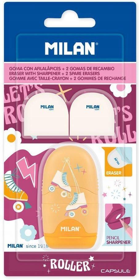 Temperówko - gumka MILAN CAPSULE ROLLER + 2 gumki zapasowe Fantazyjne połączenie temperówki i gumki w jednym. Seria specjalna ROLLER. Z jednej strony pojedyncza temperówka na cienkie kredki i ołówki. Z drugiej miękka gumka z syntetycznego kauczuku, a po środku pojemnik na ścinki. Ma ostre i wytrzymałe ostrza ze stali węglowej dzięki czemu idealnie nadaje się do wszystkich rodzajów ołówków. Posiada system bezpiecznych ostrzy, który zapobiega odłączeniu się ostrza od korpusu temperówki. Idealne do użytku szkolnego. Dostępne w 3 kolorach z nadrukami: żółtym, różowym i niebieskim. Oryginalny produkt stworzony przez własny dział badawczo-rozwojowy MILAN. Zawiera 2 dodatkowe zapasowe gumki. Gumki MILAN są produkowane w Hiszpanii od 1918 roku.