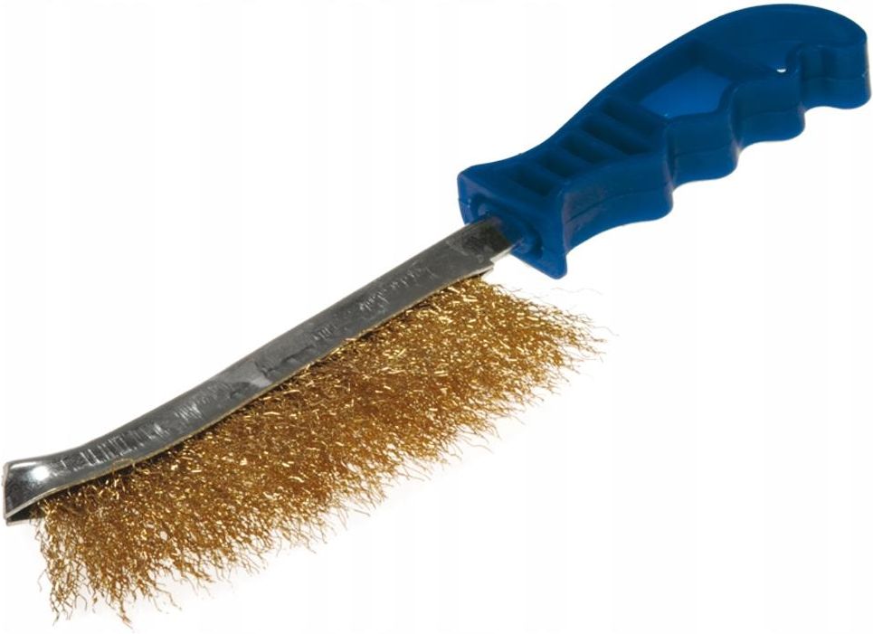 PAINTER szczotka DRUCIANA mosiądz Szczotka wykonana z wysokiej jakości karbowanego mosiężnego drutu. Przeznaczona jest do czyszczenia powierzchni metalowych z rdzy, farb, lakierów, a także do oczyszczenia spawów i gwintów. Uchwyt wykonany z mocnego plastiku o dużej wytrzymałości na złamania.