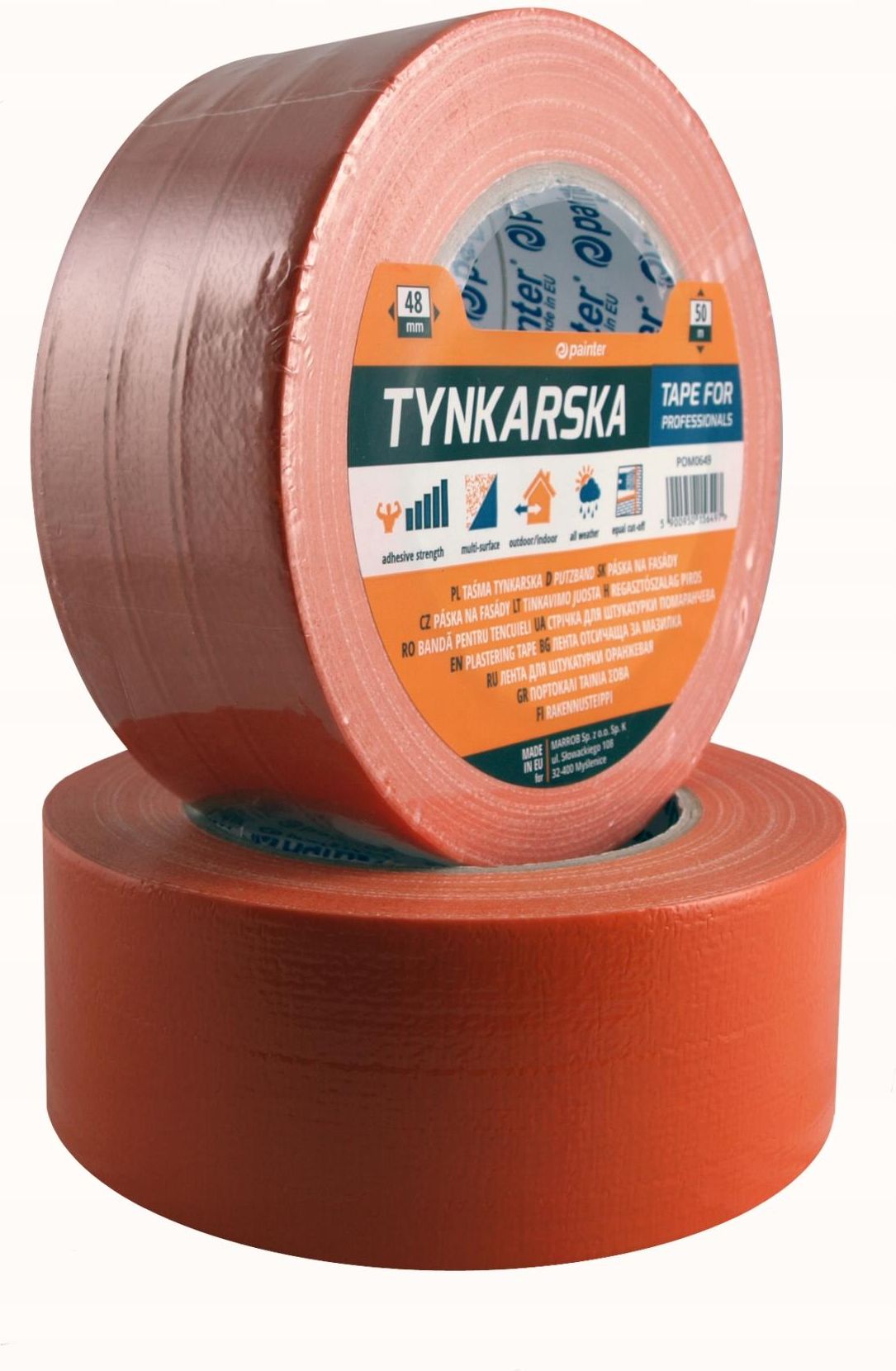 PAINTER Taśma TYNKARSKA POMARAŃCZOWA 48mmx20m POM0637 Taśma tynkarska pomarańczowa to produkt przeznaczony do używania wewnątrz jak i na zewnątrz budynku. Bardzo dobra przyczepność umożliwia stosowanie na chropowatych tynkach, gładkich powierzchniach ścian, na kamieniu, cegłach, drewnie i wielu innych podłożach. Chroni powierzchnie przed zabrudzeniem i uszkodzeniem przy pracach tynkarsko-murarskich, jak również pozwala na odcinanie różnego rodzaju tynków, dając efekt łagodnych przejść lub ostrych linii.