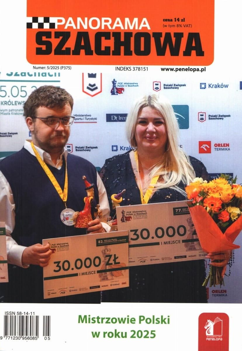 Panorama Szachowa 5/2025 Czasopismo wydawane przez wydawnictwo Penelopa. Aktualne wiadomości o wydarzeniach w świecie szachowym, relacje z imprez i zapowiedzi nadchodzących wydarzeń, info o zawodnikach, turniejach oraz porady szachowe. Stali współpracownicy czasopisma to m.in. mistrzowie Polski: Mirosława Litmanowicz, Iweta Rajlich, Jerzy Kostro, Tomasz Markowski, Bartosz Soćko, Jerzy Konikowski oraz Jacek Bielczyk, Leszek Bauda, Cezary Bigucki, Jerzy Kot, Henryk Buczinski, Jacek Matlak, Aleksander Miśta, Tomasz Lissowski, Monika Soćko, Agnieszka Brustman, Andrzej Sykuła, Adam Umiastowski.