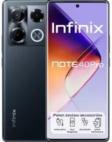 5G:nie;Alarm (budzik):tak;Aparat przedni:tak;Aparat zewnętrzny:0;Bluetooth:tak v5.2;Czas czuwania do:0 h;Czas do pełnego naładowania baterii:0;Czas pracy na baterii do:0;Częstotliwość odświeżania ekranu:120 Hz;Czujniki:akcelerometr, czujnik światła otoczenia, czujnik zbliżeniowy, żyroskop;Czytnik kart pamięci microSD:nie;Czytnik linii papilarnych:w ekranie;Dodatkowy aparat tylny:+ 2 Mpix + 2 Mpix;Dostęp do Internetu:tak;Dual SIM:tak;Dzwonki MP3:tak;Dzwonki polifoniczne:tak;EDGE:tak;Ekran dotykowy:tak;Etui dedykowane model (relacje):Infinix Note 40 Pro;Funkcje aparatu:ledowa lampa błyskowa, nagrywanie filmów Full HD 1080p, optyczna stabilizacja obrazu;Funkcje dodatkowe:Google Play;Funkcje telefonu:odbiornik GPS, rozmowy wideo (przez aplikacje), odtwarzacz MP3, tryb głośnomówiący, akcelerometr, czujnik zbliżeniowy, czytnik linii papilarnych, kompas, żyroskop, czujnik światła otoczenia;GPRS:tak;GPS:GPS, A-GPS, GLONASS, Galileo, Beidou;Gwarancja:24 miesiące;HSDPA:tak;HSPA+:tak;HSUPA:tak;Kalendarz:tak;Kalkulator:tak;Kolor:czarny;Kolor obudowy:czarny;Liczba rdzeni procesora:8-rdzeniowy;LTE:tak;Ładowanie bezprzewodowe:tak;Ładowanie:szybkie ładowanie;Ładowarka:tak;Łączność bezprzewodowa:NFC, LTE, Bluetooth, Wi-Fi;Marka procesora:MediaTek;Menu w języku polskim:tak;Model procesora:Helio G99 MT6789;Nano SIM:tak;Nawigacja: odbiornik GPS:tak;obiektyw 2:2 Mpix - f/2,4 - tylny;obiektyw 3:2 Mpix - f/2,4 - tylny;obiektyw 4:32 Mpix - f/2,2 - przód;obiektyw 5:0;obiektyw 6:0;Odporność:na pył, na wodę;Odporność – klasa:stopień ochrony IP54;Odporność – legale 1:0;Odporność – legale 2:0;Odporność – legale 3:0;Odporność – legale 4:0;Odporność – legale 5:0;Odtwarzacz audio:AAC, FLAC, MP3, OGG, WAV;Odtwarzacz audio:tak;Odtwarzacz wideo:H.264, H.265, MPEG4;Pamięć RAM:12 GB;Pamięć wbudowana:256 GB;Płatność zbliżeniowa (NFC):tak;Pojemność baterii:5000 mAh;Procesor:Helio G99 MT6789;Prosty w obsłudze:nie;Przekątna ekranu:6,78 ";Przysłona obiektywu:108 Mpix - f/1,75 - tylny główny;Radio FM:tak;Rodzaj:smartfon;Rodzaj karty SIM:nano SIM;Rodzaj karty SIM:nanoSIM - nanoSIM;Obudowa:klasyczna - ekran dotykowy;Rodzaj obudowy:klasyczna;Rodzaj pokrycia wyświetlacza :Gorilla Glass;Rozdzielczość aparatu - przód:32 Mpix;Rozdzielczość aparatu - tył:108 Mpix;Rozdzielczość ekranu:2436 x 1080 pikseli;Rozdzielczość nagrywania wideo:2K;Rozdzielczość nagrywania wideo:2K;Slot hybrydowy:nie;Standardy wysyłania/odbierania wiadomości:e-mail, MMS, SMS;Super wytrzymały:nie;System operacyjny:Android 14;System operacyjny:Android;Szybkie ładowanie:tak;Technologia wyświetlacza:AMOLED;Tryb głośnomówiący:tak;Typ gniazda ładowania:USB typ C;Waga:190 g;Wibracje:tak;Wi-Fi:tak;Wymiary (wys. x szer. x głęb.):163.60 x 74.60 x 7.75 mm;Wymienna bateria:nie;Wymienny akumulator:niewymienny;Wyposażenie:etui, kabel USB-C, słuchawki, szkło ochronne na ekran;Wyposażenie:etui, szkło ochronne na ekran;Wyświetlacz:Full HD+;Złącza:USB typ C;Komunikacja:Wi-Fi, NFC, USB, Bluetooth 5.2;zSmartfony opisy uniwersalne:1. Czytnik linii papilarnych, 1. Dual Sim, 1. LTE, 1. NFC, Aparat nagrywanie Full HD, procesor MediaTek 8 rdzeni