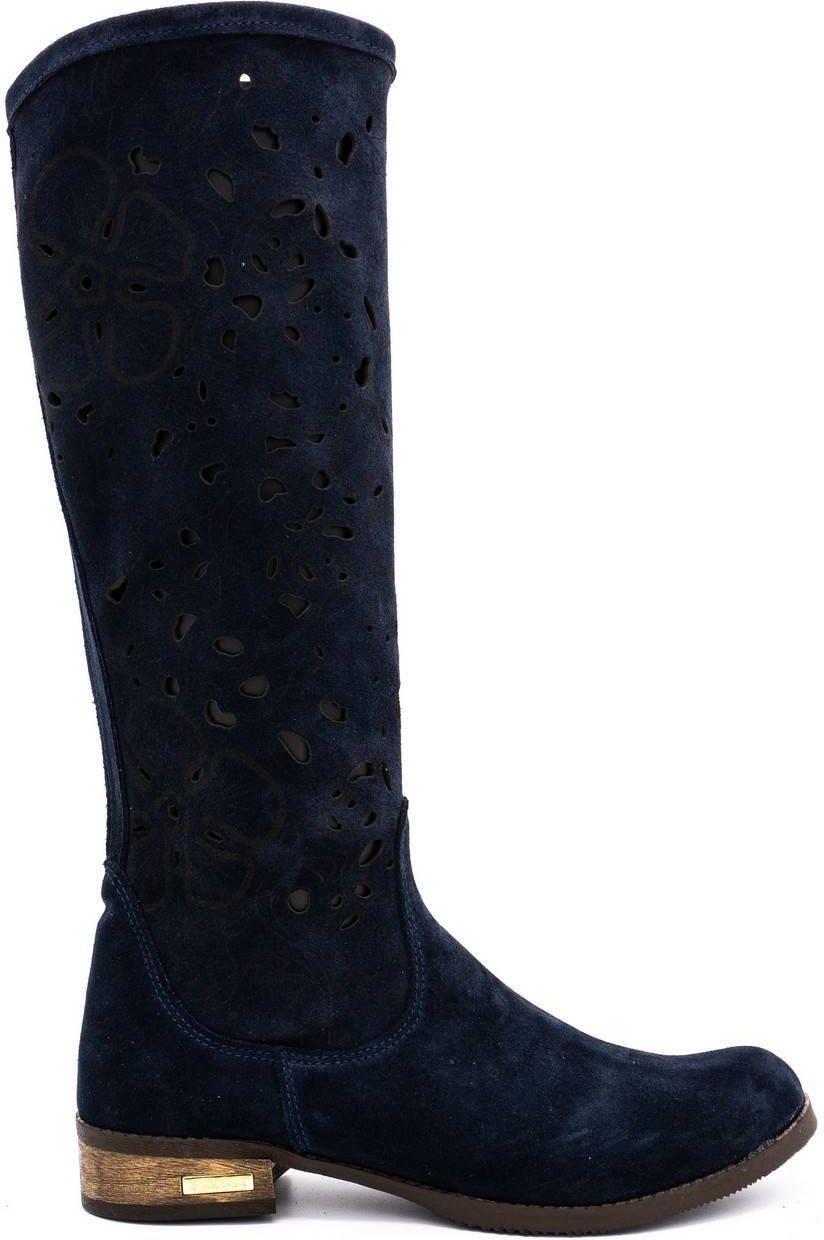 Damskie kozaki ażurowe wycięcia skóra nubuk KWIATY granatowe Damskie kozaki ażurowe wykonane są ze skóry naturalnej (nubuk). Dzięki temu są one bardzo miękkie, przyjemne w dotyku, a do tego łatwo dopasowują się do kształtu nóg. Część dolna posiada solidną podeszwę z niskim obcasem (o wysokości 3 …