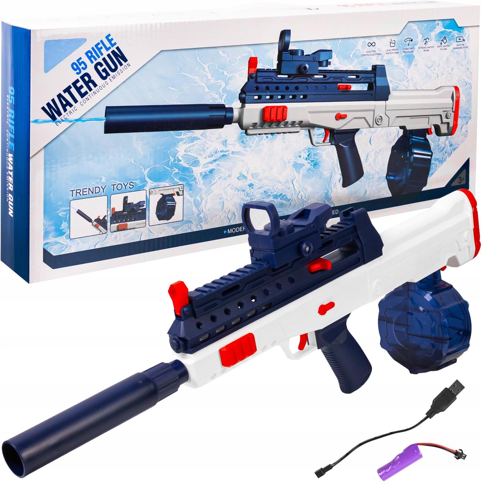 KARABIN PISTOLET NA WODĘ DLA DZIECI LUFA AUTOMATYCZNY MIOTACZ 250 ML + AKU Pistolet na wodę - sikawka akumulatorowa! Wysokiej jakości pistolet wodny to idealny prezent dla wszystkich, w każdym wieku! Jest to bezpieczna i trwała zabawka, która będzie służyć przez długie lata. Wodna zabawa z sikawką to świetny sposób na rozrywkę i ćwiczenie dla dzieci, który gwarantuje mnóstwo śmiechu i uśmiechu! Wodna zabawa jest także doskonałym sposobem na ochłodzenie się w upalne dni i na rozładowanie napięcia. Piękna, wesoła kolorystyka dodatkowo zachęci do zabawy :) Najważniejsze cechy produktu Wysoka jakość wykonania Lekka i wygodna konstrukcja Duży zasięg strzału wodnego, do 8 metrów Magazynek na wodę: 250ml Pojemny akumulator 500 mAh Pistolet posiada zbiornik na wodę oraz spust. Wystarczy nalać wodę do środka zbiornika, włożyć go do pistoletu i za pomocą naciśnięcia spustu uzyskać strzelający strumień wody. Zabawa w strzelca pomoże rozładować energię i wzmocni kondycję fizyczną Twojego dziecka. Wspomoże rozwój koordynacji wzrokowo ruchowej a także uczyskupienia uwagi i koncentracji. Karabin zasilany jest pojemnym akumulatorem 500 mAh 3.7V (w zestawie). Baterię naładujesz z pomocą dołączonego kabla USB. Nowoczesny wygląd karabinu przyciągnie uwagę nie tylko najmłodszych ;) Elementy zestawu nie posiadają żadnych ostrych krawędzi, są w pełni bezpieczne dla dzieci od 3 roku życia. Całość zapakowana w oryginalne opakowanie producenta - Idealnie nadaje się na prezent! Specyfikacja Wiek: 3+ Materiał: wysokiej jakości tworzywo sztuczne Zasilanie pistoletu: akumulator 500mAh 3,7V (w zestawie) Wymiary pistoletu z magazynkiem: 60,5 x 24 x 4 cm (dł. x wys. gł.), (z lufą) Wymiary zdejmowanej lufy: 16,5cm długości Wymiary opakowania: 47 x 20 x 7cm W zestawie znajdziesz Pistolet wodny Magazynek 250ml Atrapa celownika Wymienny akumulator Kabel USB do ładowania
