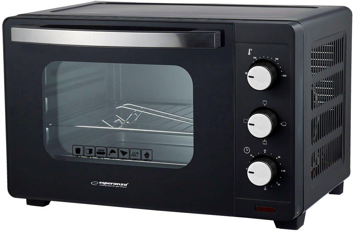 Mini piekarnik Esperanza PROSCIUTTO o pojemności 20 litrów to idealne rozwiązanie dla osób szukających kompaktowego i energooszczędnego urządzenia do codziennego użytku. Dzięki 3 funkcjom pieczenia, regulowanej temperaturze do 230°C i timerowi do 60 minut, przygotujesz ulubione dania szybko i wygodnie. W zestawie znajdziesz tackę do pizzy, ruszt do grilla oraz uchwyt do naczyń wszystko, czego potrzebujesz, by gotować wygodnie we własnym domu. Model wyróżnia się drzwiami z podwójnego, żaroodpornego szkła odpornego na wysoką temperaturę (dwie warstwy ramek), które zapewniają lepszą izolację cieplną i większe bezpieczeństwo użytkowania. Dodatkowo odległość 54.1 mm pomiędzy obudową a komorą wewnętrzną zwiększa przestrzeń i poprawia odprowadzanie ciepła. Piekarnik waży 6.1 kg, co świadczy o solidnej konstrukcji i stabilności urządzenia. Idealny do codziennego użytku Temperatura do 230°C 60-minutowy timer 3 funkcje pieczenia Drzwi z podwójnego hartowanego szkła lepsza izolacja Większa przestrzeń i skuteczniejsze odprowadzanie ciepła Pojemność: 20 litrów Moc: 1280 W Zasilanie: 220-240 V, 50/60 Hz Temperatura: 100-230°C Timer: 0-60 minut Drzwi z podwójnego szkła żaroodpornego (2 warstwy ramek) Odległość między obudową a komorą: 54.1 mm lepsze odprowadzanie ciepła Informacje o produkcie Pojemność 20 l Moc 1280 W Ilość programów 3 Funkcje 3 funkcje pieczenia Wyświetlacz LCD Nie Podstawa antypoślizgowa Tak Długość przewodu zasilającego 0.9 m Akcesoria w zestawie Tacka na pizzę Ruszt do grilla Uchwyt do garnków Materiał Metal Kolor czarny Wymiary Wymiary zewnętrzne: 46.4 × 34.4 × 29.5 cm Wymiary komory wewnętrznej: 30.9 × 25.0 × 24.1 cm Oznaczenia