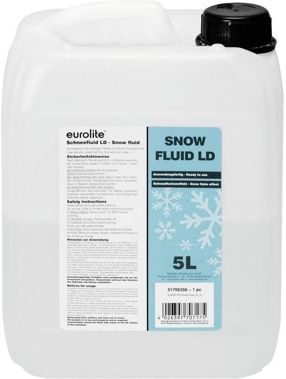Snow Fluid Eurolite LD markowy płyn do wytwornic śniegu koncentrat 2,5l. Sprzedawany w pojemniku 5l. Po rozcieńczeniu otrzymujemy płyn o niskiej gęstości do drobnego sztucznego śniegu. Wysokiej jakości produkt Zmieszać z wodą, aby uzyskać 5 litrów na lekkie płatki śniegu Bezwonny, do produkcji małych płatków piany imitujących śnieg. Bezpieczny, minimalny współczynnik zabrudzeń - prawie nie pozostawia zanieczyszczeń. Optymalny do urządzeń EUROLITE oraz ANTARI 5 litrów pojemnik (wsad 2,5l koncentratu do zalania wodą) Po rozrobieniu otrzymujemy wariant Low-density Made in Germany