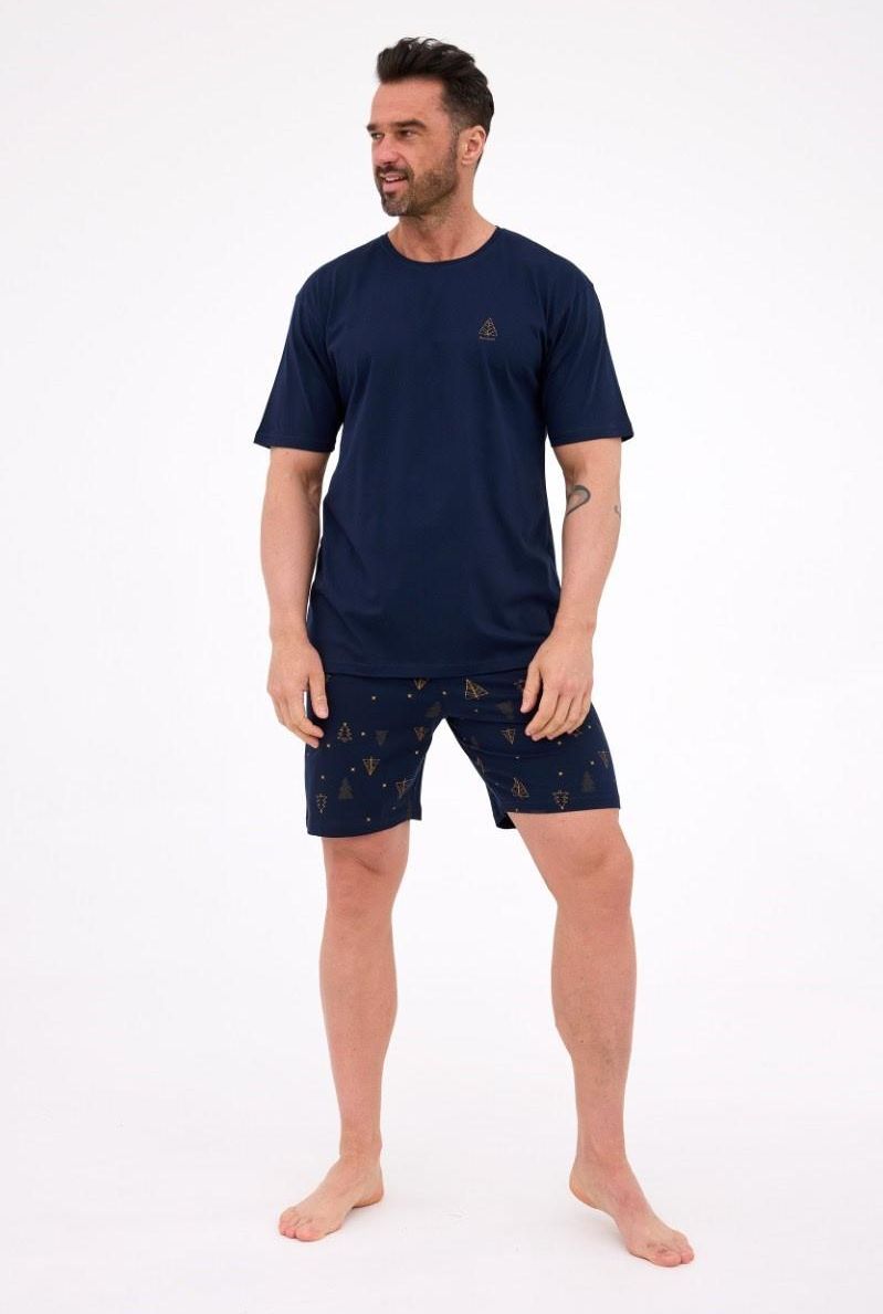 Bawełniana piżama męska koszulka z krótkim rękawem półokrągły dekolt na piersi mały nadruk spodenki krótkie, wzorzyste w pasie gumka obszyta bawełną Skład: 100% bawełna