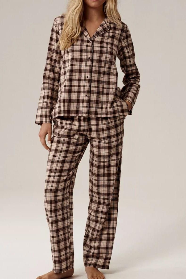Piżama o luźnym kroju we wzór w kratę z miękkiej, przyjaznej dla skóry bawełny.Bluzka o koszulowym kroju rozpinana, z kołnierzem. Spodnie mają kieszenie po bokach i nieuciskający ściągacz w pasie. Skład:100% bawełna.