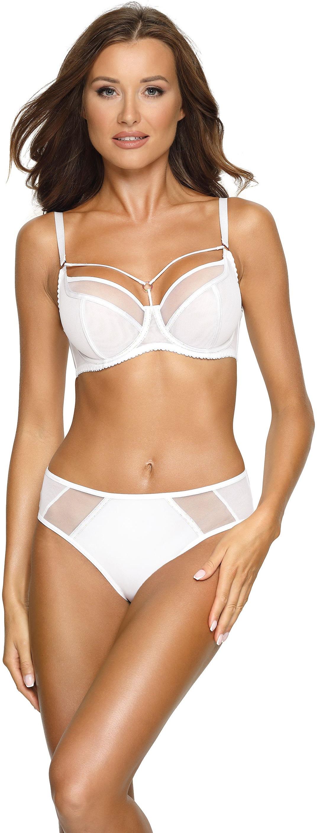 Model AV 1923 Protea w białym wydaniu to iście anielska propozycja. Delikatny, śnieżnobiały tiul łagodnie otulający piersi ozdobiony jest jedynie satynowymi taśmami obszytymi błyszczącą, kolorową nicią. Miseczki pięknie kształtują biust, nadając im naturalny owal, a elastyczny obwód utrzymuje biustonosz w odpowiednim miejscu. Rozpięte w dekolcie dekoracyjne paseczki wraz z metalowymi, wielokolorowymi kółkami podkreślają wszelkie atuty i zdobią dekolt. Skład: 88% Poliamid, 8% Bawełna, 4% Elastan Typ: soft Kolor: biały Konstrukcja: K-1391 Ramiączka: nieodpinane, szerokość dopasowana do rozmiaru, regulowane - metalowy, antyalergiczny regulator Zapięcie: dwurzędowa, trójstopniowa haftka Fiszbiny boczne: nie