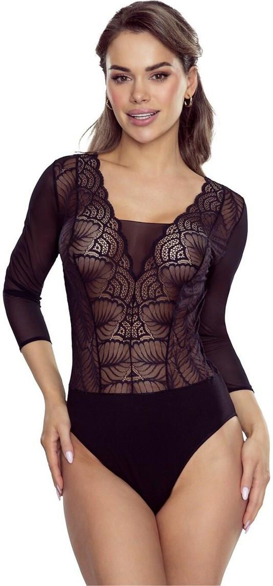 Body Gertruda to elegancki model, który łączy subtelną zmysłowość z ponadczasową klasą. Dopasowany fason pięknie podkreśla sylwetkę, a starannie dobrane detale nadają całości wyjątkowego charakteru, dzięki czemu body doskonale sprawdza się zarówno w stylizacjach codziennych, jak i wieczorowych. Górna część oraz rękawy zostały wykonane z elastycznej, półtransparentnej siateczki ozdobionej dekoracyjnym wzorem, który delikatnie podkreśla linię talii i dodaje stylizacji lekkości. Głęboki dekolt w kształcie litery V z przodu i na plecach pięknie eksponuje szyję oraz obojczyki, nadając całości elegancki i kobiecy charakter. Rękawy o długości 3/4 z lekkiego tiulu wprowadzają subtelną lekkość i podkreślają wyrafinowany styl modelu. Dolna część body jest gładka i kryjąca, dzięki czemu całość doskonale układa się pod spodniami lub spódnicą, zapewniając estetyczny wygląd stylizacji. Materiał zawierający 65% wiskozy, 30% poliamidu oraz 5% elastanu jest miękki, elastyczny i komfortowy w noszeniu, dobrze dopasowując się do ciała. Body Gertruda zapinane jest na praktyczne trójrzędowe haftki, które zwiększają wygodę użytkowania. Model został wyprodukowany w 100% w Polsce, co gwarantuje staranne wykonanie oraz wysoką jakość materiałów. Kolor: czarny Skład surowcowy: 65% wiskoza, 30% poliamid, 5% elastan Szerokość w biuście(cm): S-44, M-46, L-49, XL-52 Szerokość dołu(cm): S-40, M-42, L-45, XL-48 Szerokość dołu rękawa(cm): S-10,5, M-11, L-12, XL-13 Długość całkowita(cm): S-73, M-75,5, L-78, XL-80,5 Długość boku(cm): S-32,5, M-32,5, L-33, XL-33 Długość rękawa(cm): S-44, M-44,5, L-45, XL-45,5 Wymiary opakowania (długość-szerokość-wysokość) cm: 20/2/25
