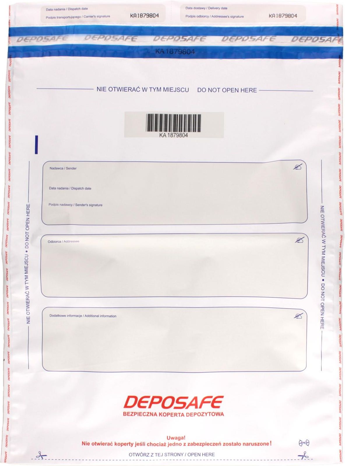 Koperty DEPOSAFE stanowią idealne rozwiązanie dla osób, które wysoce cenią sobie bezpieczeństwo swoich przesyłek. Wykonane zostały z mocnej, trzywarstwowej folii polietylenowej, dzięki której nie ma możliwości otworzenia koperty bez pozostawienia śladu. Istotną z punktu widzenia bezpieczeństwa cechą kopert DEPOSAFE jest zastosowanie systemu tzw. indykatorów, czyli elementów koperty chroniących przed próbami jej nieautoryzowanego otworzenia. Koperty o szerokim spectrum zastosowań, idealnie sprawdzą się w branży finansowej, instytucjach państwowych itp. Wyposażona w praktyczny pasek samoprzylepny gwarantujący trwałe zamknięcie koperty.