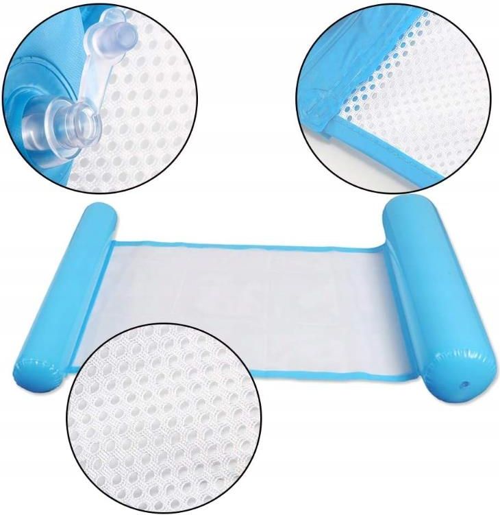 Materac jest bardzo praktyczny, świetnie sprawdza się w upalne dni zarówno nad jeziorem, jak i na basenie. Pozwala na wygodny i relaksujący odpoczynek w wodzie, dodatkowo skutecznie ochładza dzięki możliwości znacznego zanurzenia się w wodzie. Wykonany z trwałego materiału, zapewnia stabilność i komfort podczas wypoczynku. Materiał: PVC Kolor: niebieski Wymiary: 120 x 70 cm Maksymalna liczba osób: 1 osoba dorosła Grubość PVC: ok. 0,22 mm Charakterystyka: 1. Jego ergonomiczny kształt zapewnia optymalne podparcie dla pleców i głowy, umożliwiając Ci w pełni zrelaksować się i cieszyć się spokojnymi chwilami na wodzie. 2. Po złożeniu zajmuje niewiele miejsca, co sprawia, że można zabrać go do torby lub bagażu i bez problemu przemieścić w miejsce wypoczynku. 3. Niebieski kolor hamaku dodaje uroku i wyróżnia go na tle innych akcesoriów do pływania. 4. Świetnie sprawdzi się jako hamak do pływania na wodzie, wałek pomocniczy do pływania, krzesło wodne, czy leżak na plaże.
