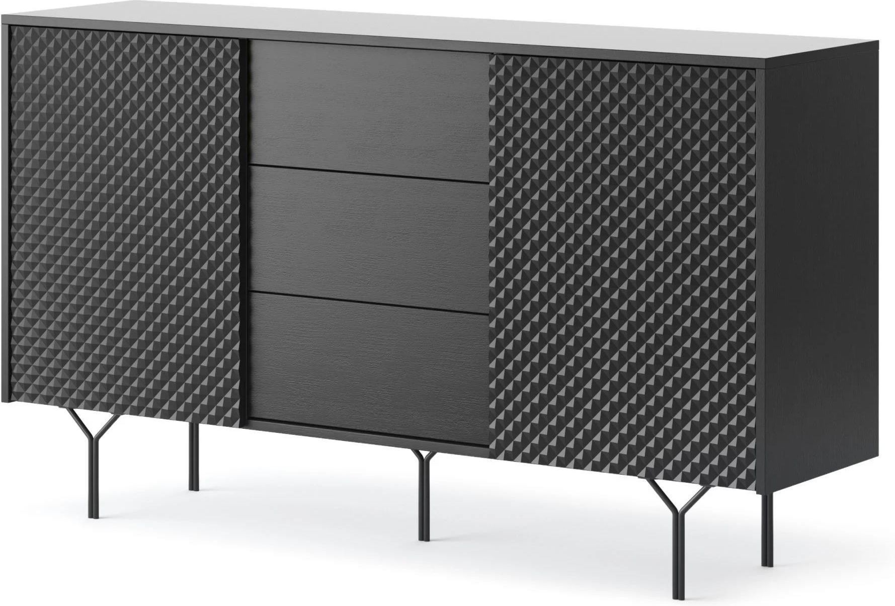 Komoda RAVEN Kolekcja RAVEN to bardzo nowoczesne meble osadzone na czarnych, stalowych nóżkach, które nadają lekkości całej konstrukcji. Meble te charakteryzują się solidnym wykonaniem - wytrzymała i odporna płyta MDF. Wyjątkowy efekt 3D na frontach sprawi, że wnętrze nabierze eleganckiego oraz niepowtarzalnego charakteru. Jest to idealne rozwiązanie dla wszystkich lubiących modernistyczne aranżacje wnętrz. Wymiary Szerokość: 144 cm Wysokość: 83 cm Głębokość: 38 cm Dostępny kolor Czarny grafit