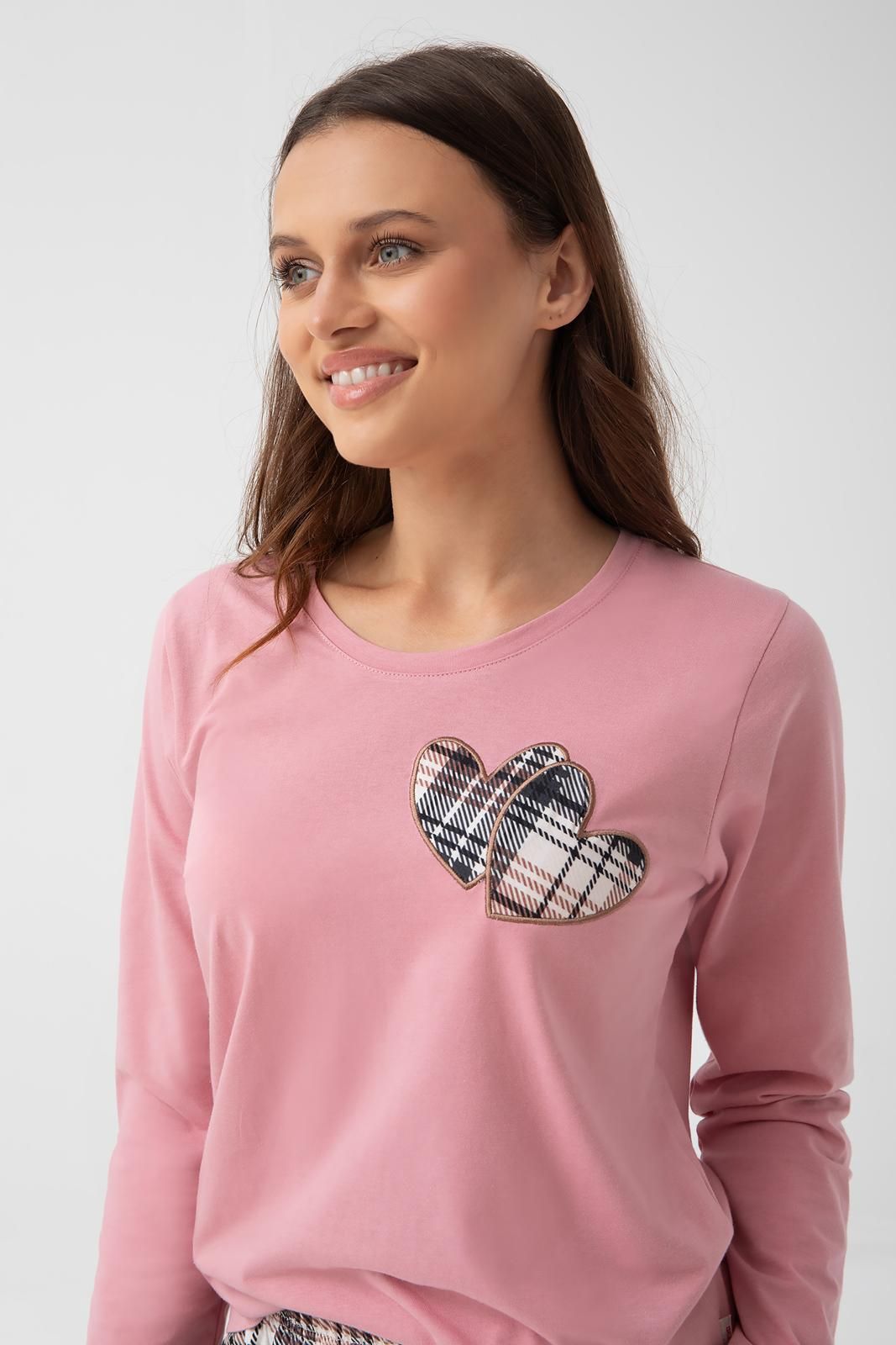 Piżama damska LUNA kod 322 różowa aplikacja dwa serca spodnie w kratę Sieradz