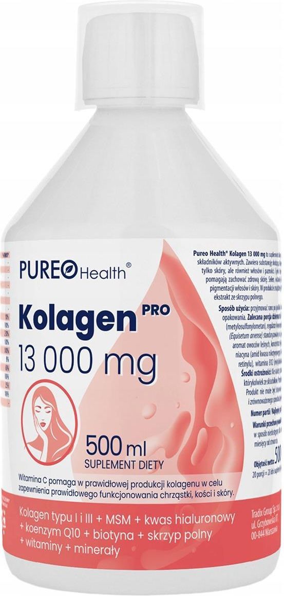 Pureo Health Kolagen PRO 13 000 mg Kolagen typu I i III + MSM + kwas hialuronowy + koenzym Q10 + biotyna + skrzyp polny + witaminy + minerały✅ Suplement diety - 500 ml⭐ NAJLEPIEJ SPOŻYĆ PRZED: 2027.04.30 Pureo Health Kolagen pro 13 000 mg to suplement diety w płynie o smaku owoców leśnych na bazie hydrolizowanego kolagenu z dodatkiem 14 składników aktywnych. Zawiera substancję słodzącą. Kolagen jest białkiem naturalnie występującym w organizmie ludzkim. Wchodzi w skład nie tylko skóry, ale również włosów i paznokci. Cynk i biotyna wpływają korzystnie na stan i kondycje skóry oraz włosów. Niacyna i witamina A pomagają zachować zdrową skórę. Selen, witaminy C i E dodatkowo działają antyoksydacyjnie. Miedź pomaga w utrzymaniu prawidłowej pigmentacji włosów i skóry. W produkcie znajdziemy także składniki uzupełniające takie jak koenzym Q10, kwas hialuronowy, krzem, MSM oraz ekstrakt ze skrzypu polnego. Składniki aktywne (w 25 ml) Składnik, Ilość, % RWS* Hydrolizowany kolagen, 13 000 mg, --- MSM (metylosulfonylometan), 500 mg, --- Kwas hialuronowy, 60 mg, --- Koenzym Q10, 10 mg, --- Ekstrakt z ziela skrzypu polnego (Equisetum arvense), standaryzowany na 70% krzemionki, 110 mg, --- - w tym: Krzemionka, 7,7 mg, --- Witamina A, 400 µg, 50% Witamina E, 12 mg, 100% Witamina C, 200 mg, 250% Niacyna (witamina B3), 16 mg, 100% Biotyna, 150 µg, 300% Kwas foliowy, 15 µg, 8% Witamina B12, 1,5 µg, 60% Krzem (łącznie z ekstraktu i innych źródeł), 40 mg, --- Cynk, 10 mg, 100% Miedź, 0,25 mg, 25% Selen, 55 µg, 100% * %RWS – Referencyjna Wartość Spożycia Składniki Hydrolizowany kolagen wołowy, woda wielokrotnie filtrowana, MSM (metylosulfonylometan), regulator kwasowości - kwas cytrynowy, witamina C (kwas L-askorbinowy), ekstrakt z ziela skrzypu polnego (Equisetum arvense) standaryzowany na zawartość 7% krzemionki, kwas hialuronowy, cynk (pikolinian cynku), naturalny aromat owoców leśnych, koncentrat soku z buraka, witamina E (DL-alfa tokoferol), substancja konserwująca (sorbinian potasu), niacyna (amid kwasu nikotynowego), koenzym Q10, miedź (diglicynian miedzi), biotyna (D-biotyna), witamina A (palmitynian retinylu), witamina B12 (metylokobalamina), kwas foliowy (kwas pteroilomonoglutaminowy), selen (selenian (VI) sodu). Produkt nie zawiera sztucznych barwników. Produkt bezglutenowy. Smak i kolor są pochodzenia w 100% naturalnego. Objętość netto: 500 ml. 20 porcji = 20 dni suplementacji. Sposób użycia Przyjmować rano po posiłku. Przed użyciem delikatnie wstrząsnąć, odmierzyć dawkę i wypić. Miarka dołączona jest do opakowania. Zalecana porcja dzienna to 25 ml. Warunki przechowywania Chronić przed światłem. Przechowywać w temperaturze pokojowej, w suchym miejscu, w sposób niedostępny dla małych dzieci. Po otwarciu produkt należy przechowywać w lodówce. Spożyć w ciągu 2 miesięcy od otwarcia. Środki ostrożności Nie należy przekraczać zalecanej dziennej porcji w ciągu dnia. Nie stosować w przypadku uczulenia na którykolwiek ze składników. Produkt dla dorosłych. Spożywania produktu nie zaleca się kobietom w ciąży i karmiącym piersią. Produkt nie może być stosowany jako substytut zróżnicowanej diety. Ważne jest prowadzenie zdrowego trybu życia i zrównoważonego sposobu żywienia.