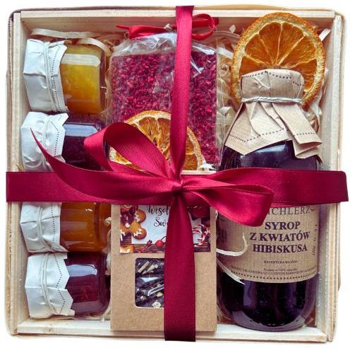 Zestaw prezentowy - Święta Bożego Narodzenia, Mikołaj Nasze kosze prezentowe to doskonały wybór na każdą okazję! Starannie dobrane produkty, eleganckie opakowanie oraz dbałość o szczegóły sprawiają, że każdy zestaw zachwyci obdarowaną osobę. Prezent nie musi być nudny – nasze propozycje to połączenie jakości, estetyki i wyjątkowego smaku. Dlaczego warto wybrać kosz prezentowy? Uniwersalny wybór – nasze zestawy pasują na różne okazje, od urodzin, przez święta, aż po podziękowania. Dbałość o jakość – każdy produkt w zestawie jest starannie wyselekcjonowany, aby spełnić oczekiwania nawet najbardziej wymagających osób. Gotowy do wręczenia – kosz jest elegancko zapakowany, ozdobiony wstążką i zabezpieczony folią. Co znajdziesz w środku ? Herbata liściasta (50g) – wysokogatunkowa, aromatyczna mieszanka dla miłośników herbacianych rytuałów. 6 słoiczków miodu kremowanego po 40 g, każdy z naturalnymi dodatkami: Miód kremowany z mango Miód kremowany z pomarańczą Miód kremowany z maliną Miód kremowany z jagodą Miód kremowany z kakao Miód kremowany z wiśnią Nabierak do miodu – dodatek do miodu, który pozwala w łatwy sposób dozować złoty przysmak. Dodatkowe atuty: Opakowanie zwarte, twarde i odporne na uszkodzenia Doskonałe do powtórnego wykorzystania Ozdobne wypełnienie z wełny drzewnej – estetyczne i ekologiczne Pudełko fasonowe z okienkiem 20 x 20 x 5 cm Gotowy pomysł na prezent! Nie masz pomysłu na prezent? Nasze kosze to idealne rozwiązanie! Zapakowane z najwyższą starannością, dostarczane ekspresowo – wszystko po to, abyś mógł obdarować bliskich w wyjątkowy sposób. Gdzie sprawdzą się nasze kosze prezentowe? Święta Bożego Narodzenia – wprowadź magię świąt, wręczając wyjątkowy prezent. Urodziny i imieniny – podarunek, który zaskoczy i ucieszy każdego solenizanta. Podziękowania – wyraz wdzięczności w eleganckim stylu Zamów już dziś! Nie czekaj – wybierz kosz prezentowy, który zachwyci Twoich bliskich. Sprawdź również inne nasze propozycje i znajdź zestaw idealny na każdą okazję