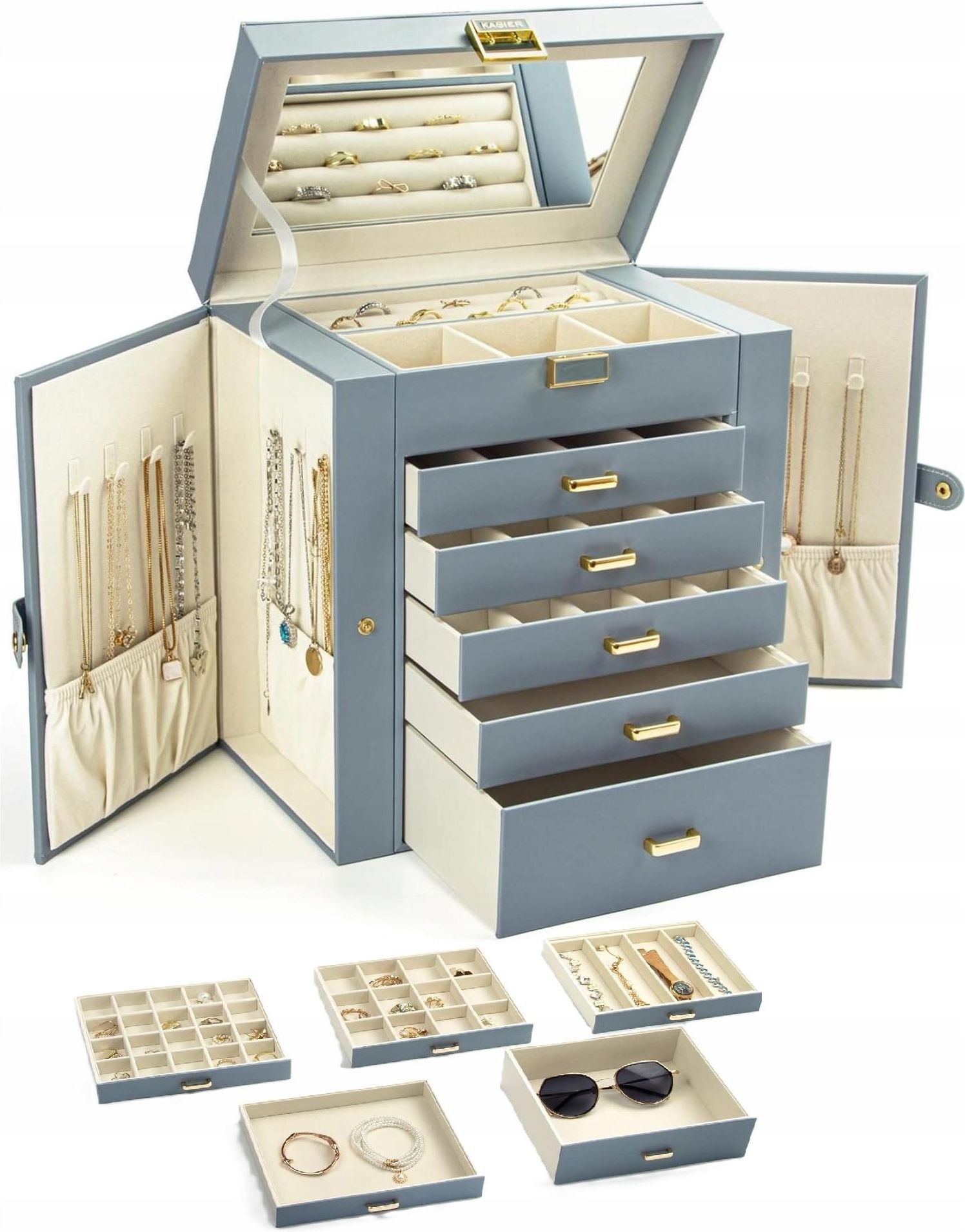 Szkatułka Na Biżuterię Organizer Kuferek Elegancki Pojemny Pudełko Duży NA PREZENT Eleganckie, Duże Pudełko na Biżuterię KAMIER! 6 Warstw, 5 Szuflad, Wbudowane Lustro, 2 Ukryte Szafki Boczne (16 Haczyków), Kolor Niebiesko-Szary, Materiały Premium (Drewno + Skóra PU + Aksamit). KAMIER 6-warstwowe …