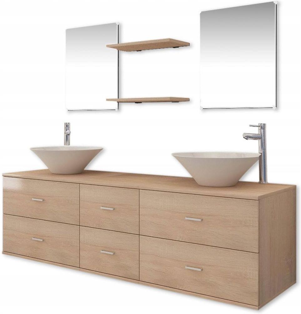 9-cz. zestaw do łazienki z umywalkami i kranem, beżowy Ten kompletny zestaw, składający się z szafki montowanej na ścianie, 2 luster, 2 półek 2 umywalek oraz 2 kranów, będzie znakomitym dodatkiem do Twojej łazienki, optymalnie wykorzystującym jej przestrzeń bez rezygnacji ze stylu. Szafka pod …