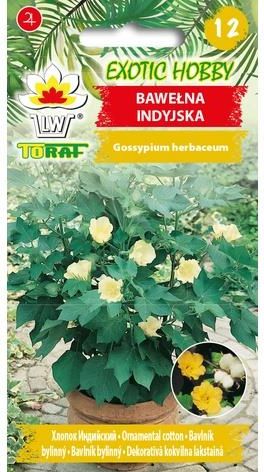 Bawełna indyjska - Gossypium herbaceum Roślina wieloletnia, wysokości do 80 cm do uprawy w pojemnikach, na tarasach, balkonach i w zimowych ogrodach. Od lata do jesieni na roślinach pojawiają się duże kremowo-żółte lub różowe dzwonkowate kwiaty. Po przekwitnięciu wartość dekoracyjną stanowią białe, pomponowe, wełniste owocostany. Cięte pędy wraz z owocostanami stosowane są w suchych bukietach. Siew II-V po 2-3 do doniczek o średnicy 6-8 cm lub na palety. W temp. powyżej 20ºC, wschody następują po 7-14 dniach. Siewki w fazie 4-5 liści uszczknąć, aby wywołać krzewienie. Uprawiać w miejscu nasłonecznionym w żyznym podłożu. Wzrost:60-80 cmSiew:II-VKwitnienie:VI-X Oferowane nasiona w opakowaniu zawierające 5 sztuk nasion. Oświadczam, że zgodnie z Rozporządzeniem Parlamentu Europejskiego i Rady (UE) 2016/2031 z dnia 26 października 2016 r. w sprawie środków ochronnych przeciwko agrofagom roślin, zmieniającym rozporządzenia Parlamentu Europejskiego i Rady (UE) nr 228/2013, (UE) nr 652/2014 i (UE) 1143/2014 oraz uchylającym dyrektywy Rady 69/464/EWG, 74/647/EWG, 93/85/EWG, 98/57/WE, 2000/29/WE, 2006/91/WE i 2007/33/W do każdej jednostki handlowej dołączony jest paszport roślin. Zamieszczone zdjęcia w naszych ofertach są autorskie i przedstawiają tylko nasze wyhodowane rośliny. Sadzonki roślin w zależności od pory roku mogą się różnić wyglądem np. barwą liści, brakiem ulistnienia, przebarwieniem kory, brakiem części nadziemnej (szczególnie dotyczy bylin) itp. Wszystkie zamówienia realizujemy przez cały rok kalendarzowy wg kolejności zamówień. Rośliny wysyłamy od poniedziałku do czwartku (do godziny 12.00) z gwarancją dotarcia na drugi dzień do klienta. Zapraszamy do skorzystania z naszej szerokiej oferty roślin ozdobnych i nasion.
