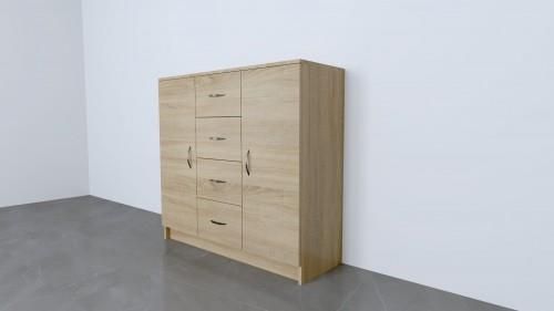Komoda wykonana z płyty meblowej o grubości 18 mm; z szufladami i szafkami część lewa - szafka z półką + drzwi lewostronne część środkowa - 4 szuflady część prawa - szafka z półką + drzwi prawostronne Wymiary wysokość: 112 cm szerokość: 120 cm głębokość: 40 cm Dostępna w różnych kolorach.