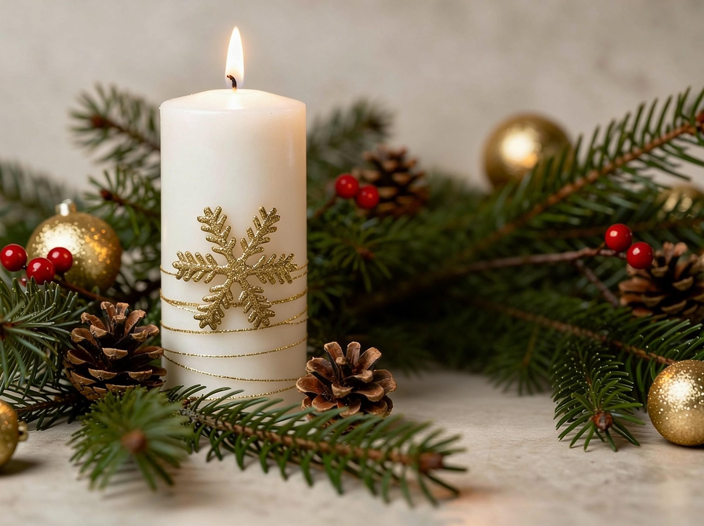 Świeca pieńkowa Golden Christmas w pięknej, białej barwie to efektowna propozycja marki ADPAL, która łączy klasyczną formę z subtelnym świątecznym blaskiem. Jej matowa powierzchnia harmonijnie kontrastuje z brokatowym motywem śnieżynki i pasów, tworząc elegancką dekorację idealną do zimowych aranżacji. Dzięki wysokości 15 cm i średnicy 7 cm świeca prezentuje się stabilnie i stylowo, a czas palenia sięgający około 59 godzin pozwala cieszyć się nastrojowym światłem przez wiele wieczorów. Świeca pięknie sprawdzi się jako centralna ozdoba świątecznego stołu — ustawiona na złotej, szklanej lub lustrzanej tacy stworzy wyjątkowy klimat podczas rodzinnych spotkań. Zestawiona z naturalnymi gałązkami świerku, białymi akcentami i dodatkami w kolorze złota podkreśli zimową elegancję wnętrza. Rewelacyjnie prezentuje się także na komodzie, parapecie lub w latarence, dodając pomieszczeniu przytulności i świątecznej magii. Doskonale komponuje się ze stroikami adwentowymi oraz zimowymi kompozycjami z szyszek, bombek i gałązek. Warto zwrócić uwagę, że świeca dostępna jest również w innych rozmiarach i formach, dzięki czemu można stworzyć spójną, efektowną kolekcję, idealną do dekoracji całego domu. Zestawienie kilku świec Golden Christmas w różnych wysokościach pozwala uzyskać piękny, harmonijny efekt świetlny, który idealnie dopełni świąteczne aranżacje. To nie tylko dekoracja, ale także wyjątkowy sposób na wprowadzenie ciepła i magicznej atmosfery do Twojego wnętrza. Zdjęcie aranżacyjne ma charakter poglądowy. Prezentowana aranżacja może zawierać elementy dekoracyjne niewchodzące w skład zestawu. Szczegóły dotyczące zawartości znajdują się w opisie produktu.