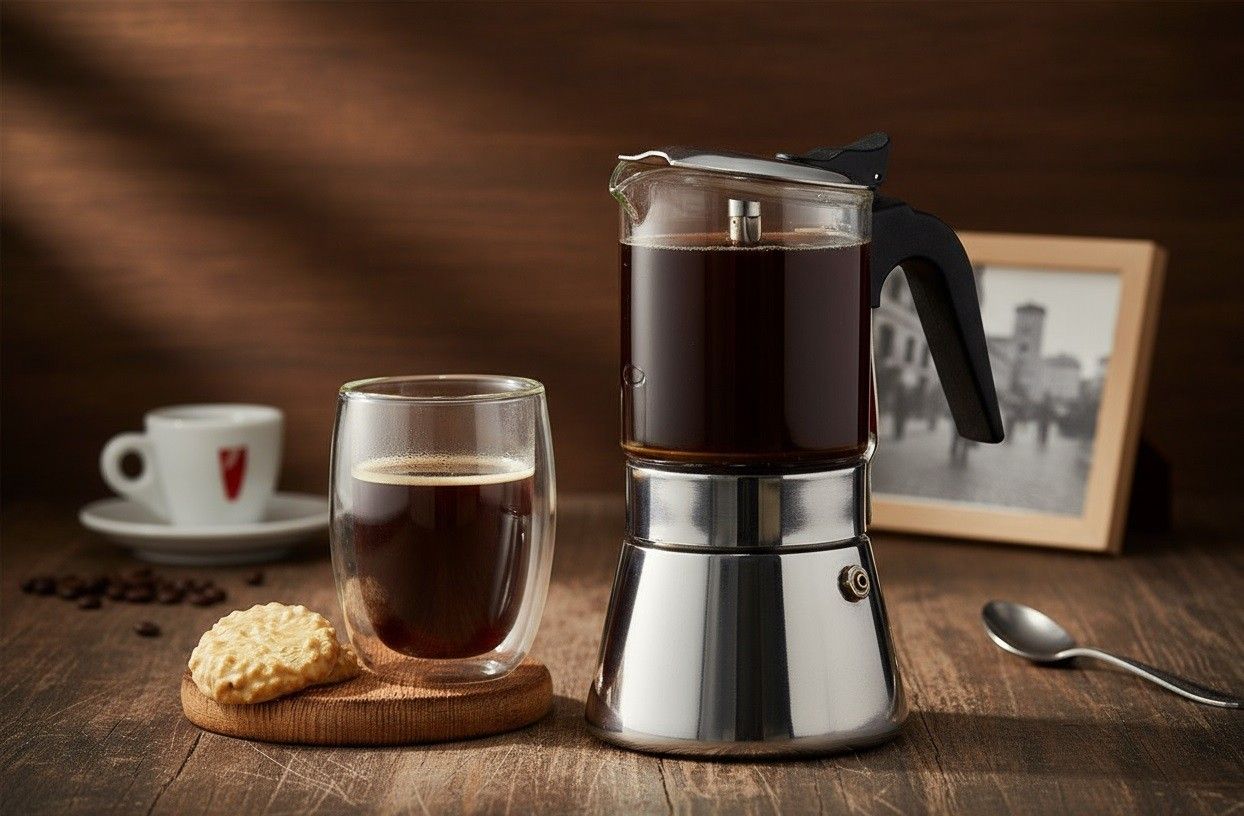 Kafetiera stalowa z przezroczystym zbiornikiem Ambition Evie 240 ml Kafetiera Ambition Evie to eleganckie połączenie funkcjonalności i stylu, które pozwoli Ci delektować się perfekcyjnie zaparzoną kawą każdego dnia. Wykonana z wysokogatunkowej stali nierdzewnej i wytrzymałego szkła, zachwyca nowoczesnym designem i dbałością o detale. Transparentny zbiornik umożliwia obserwowanie procesu parzenia, dodając codziennemu rytuałowi wyjątkowej przyjemności i estetyki. Dzięki ergonomicznemu uchwytowi kawiarka pewnie leży w dłoni, a precyzyjny dzióbek ułatwia nalewanie kawy bez rozlewania. Uniwersalne dno sprawia, że model Evie jest kompatybilny ze wszystkimi rodzajami kuchenek – również indukcyjnymi. To idealny wybór dla osób, które cenią jakość, elegancję i wyjątkowy aromat świeżo zaparzonego espresso. Cechy produktu: • Pojemność: 240 ml • Wysokość: 18,5 cm • Długość: 13,5 cm • Szerokość: 11,5 cm • Waga: 0,62 kg • Materiał: stal nierdzewna, szkło, tworzywo sztuczne • Kolor: czarny, srebrny, przezroczysty • Zastosowanie: indukcja, kuchenka gazowa, elektryczna i płyta ceramiczna • Marka: Ambition Kafetiera Ambition Evie to nie tylko praktyczne urządzenie, ale również designerski akcent w kuchni. Sprawdzi się doskonale zarówno podczas codziennego poranka, jak i w czasie spotkań z bliskimi, gwarantując aromatyczną kawę o doskonałym smaku. Zdjęcie aranżacyjne ma charakter poglądowy. Prezentowana aranżacja może zawierać elementy dekoracyjne niewchodzące w skład zestawu. Szczegóły dotyczące zawartości znajdują się w opisie produktu.