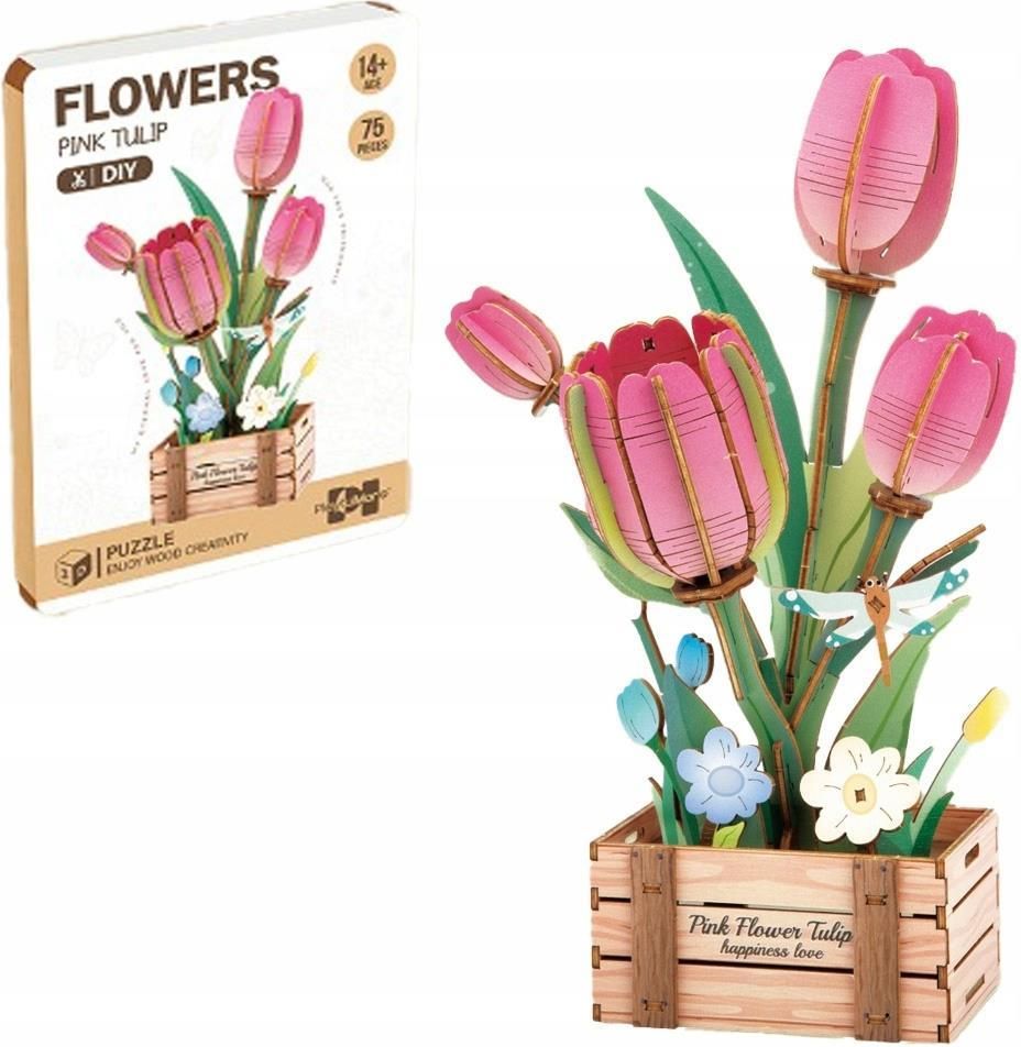 DIY Drewniane kwiatki puzzle 3D tulipany w skrzynce 14+ Askato 1 sztuka Stwórzcie własną, niepowtarzalną dekorację idealną do wszystkich wnętrz. Zestaw drewnianych puzzli to doskonała propozycja dla osób lubiących kreatywne projekty i piękne, naturalne ozdoby. Kwiaty, które nigdy nie zwiędną, możesz złożyć samodzielnie z 75 drewnianych elementów, tworząc uroczy mini-bukiet w skrzynce. To idealny sposób na relaks, rozwijanie zdolności manualnych i dodanie wnętrzu odrobiny wiosennego nastroju. Piękna dekoracja – drewniane tulipany prezentują się stylowo i pasują do każdego wnętrza. Zestaw dla każdego – świetne zajęcie odstresowujące i twórcze. Trwałe i ekologiczne – wykonane z drewna, lekkie, a jednocześnie solidne Uniwersalny i twórczy prezent – idealny na urodziny, Dzień Kobiet, walentynki czy jako upominek bez okazji. Prosta i przyjemna budowa dzieła – 75 elementów, które łatwo połączyć w efektowną kompozycję. Wymiary produktu: 11 × 8 × 21 cm Wymiary opakowania: 14.7 × 1 × 20 cm Ilość elementów: 75 Minimalny wiek: od 14 lat