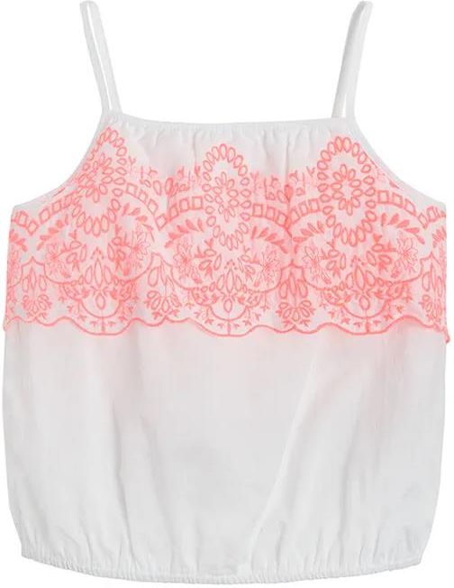 Bluzka na ramiączka dla dziewczynki: - kolor: biały - neonowy koralowy haft - cienkie ramiączka - dodatkowa warstwa materiału na górze - dół zakończony gumką Materiał i technologie: - 100% bawena (gramatura 80 g/m2) - cienki materiał Pranie i pielęgnacja: - Prać z podobnymi kolorami w temperaturze do 40° C. - Prać i prasować po lewej stronie.