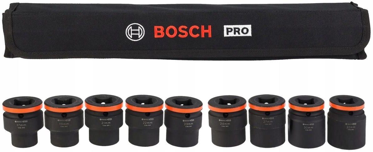 Zestaw 9 nasadek udarowych 3/4" PRO Impact Socket Set firmy BOSCH. W wyposażeniu oferowanego zestawu nasadek znajdują się: nasadka 3/4" średnica 17 mm długość 51 mm nasadka 3/4" średnica 19 mm długość 51 mm nasadka 3/4" średnica 21 mm długość 51 mm nasadka 3/4" średnica 22 mm długość 51 mm nasadka 3/4" średnica 23 mm długość 51 mm nasadka 3/4" średnica 24 mm długość 51 mm nasadka 3/4" średnica 27 mm długość 54 mm nasadka 3/4" średnica 30 mm długość 54 mm nasadka 3/4" średnica 32 mm długość 57 mm etui z trwałej tkaniny na nasadki Parametry techniczne: Długość nasadek: 51 - 57 mm Rodzaj nasadek: udarowe Uchwyt narzędziowy: 3/4" Materiał wykonania: stal chromowo-molibdenowa (CrMo) Ilość nasadek w zestawie 9 szt. Numer katalogowy producenta: 2608003041 Nasadki udarowe PRO Impact Socket Set firmy BOSCH przeznaczone są do ciężkich prac z zastosowaniem wysokich momentów obrotowych przy użyciu wkrętarek bądź zakrętarek udarowych. Zestaw nasadek świetnie sprawdzi się w domowym warsztacie, specjalistycznym serwisie oraz przy konstrukcjach stalowych czy betonowych. Nasadki wykonane zostały z wysokogatunkowej stali chromowo-molibdenowej która jest bardziej elastyczna i odporna na uszkodzenia mechaniczne. Nasadki posiadają otwory ustalające dla kluczy wyposażonych w blokadę nasadki. Krótkie nasadki (51-57 mm) zapewniają dużą wygodę pracy. Budowa nasadek może przenosić duże siły obrotowe co umożliwia osiągnięcie optymalnej siły dokręcenia. Grube ścianki nasadek sprawiają że są one odporne na wysoki moment obrotowy. Czarna powłoka fosforanowa zapewnia dodatkową warstwę ochrony przed rdzą i korozją. Laserowe oraz kolorowe oznaczenia zapewniają łatwiejszą orientację dzięki czemu z łatwością można odnaleźć właściwy rozmiar nasadki. Pokrowiec ochronny - wykonany z trwałego, sztywnego i odpornego na uszkodzenia materiału, pozwala na bezpieczny transport i przechowywanie nasadek. Dostawa zawiera 9 nasadek udarowych PRO Impact Socket Set firmy BOSCH
