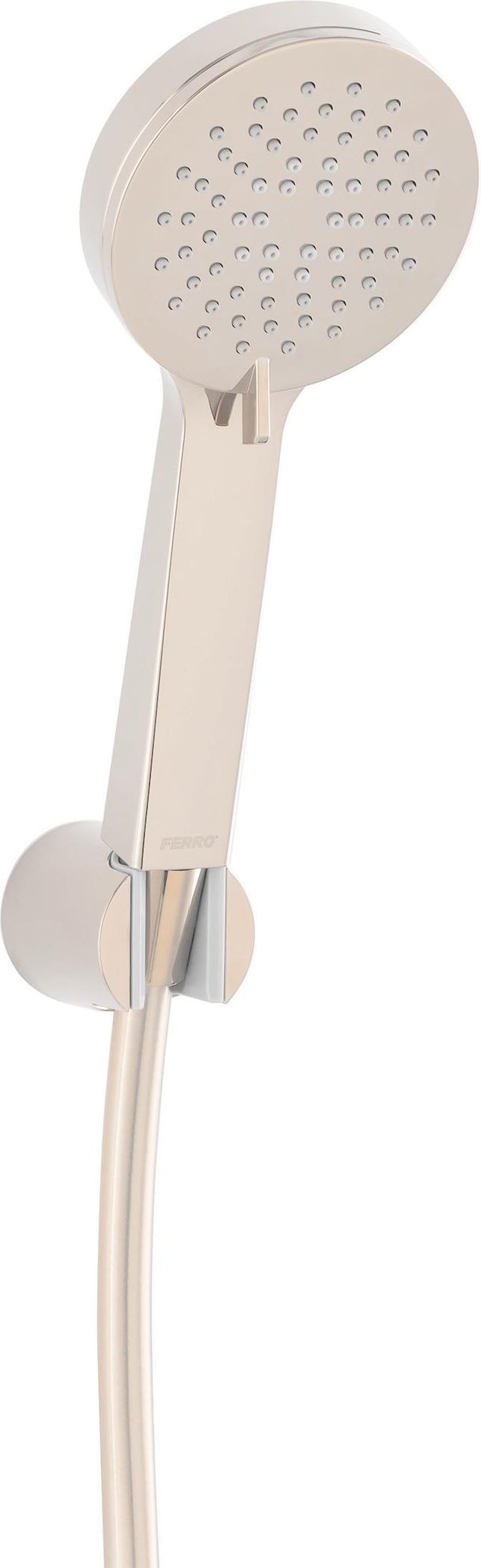 RILLO zestaw natryskowy punktowy, jasno złoty Producent: Ferro Kod produktu: U365G Kompletny zestaw natryskowy w unikalnym jasno złotym kolorze. Zestaw składa się z wielofunkcyjnej, okrągłej rączki natryskowej, minimalistycznego uchwytu ściennego oraz trwałego węża z anty-skrętną końcówką. …