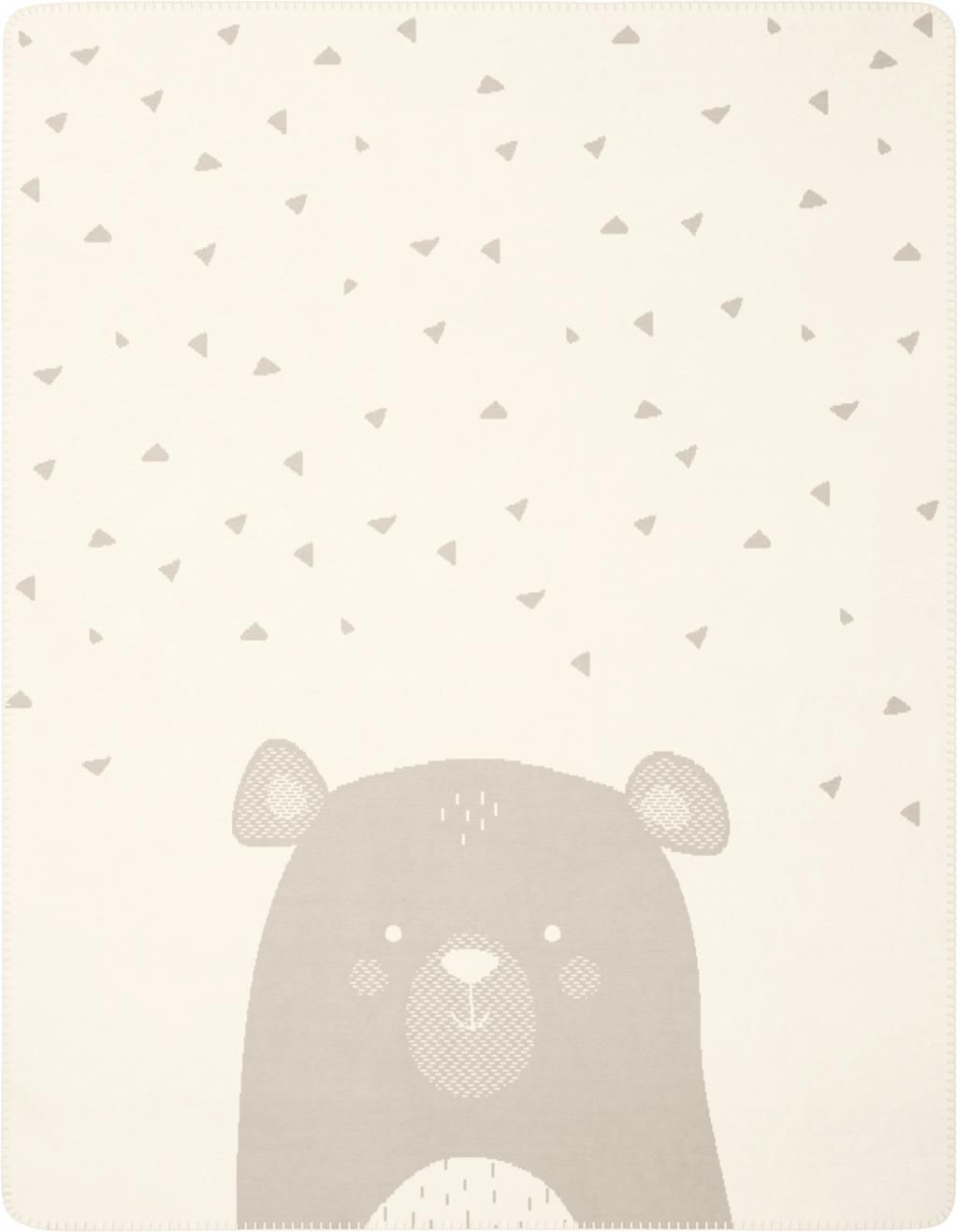 Uroczy kocyk dziecięcy, utrzymany w stonowanej kolorystyce.