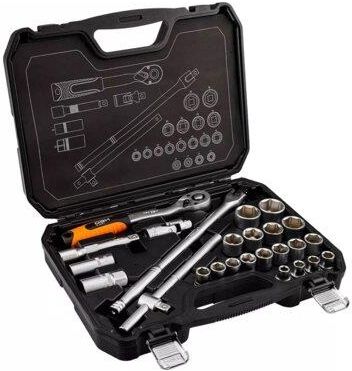 Wielozadaniowy zestaw kluczy ½” wysokiej jakości, zawierający 25 sztuk narzędzi oraz akcesoriów od marki NEO TOOLS. Produkty oferowane w praktycznej walizce z tworzywa sztucznego z solidnymi zatrzaskami. Dodatkowo, wnętrze opakowania zostało wyłożone specjalną wkładką, która umożliwia utrzymanie porządku i zabezpiecza zawartość przed uszkodzeniem. Zestaw składa się z: grzechotki ½” (precyzyjny mechanizm zapadkowy z 72 zębami), 18 sztuk nasadek sześciokątnych ½” w rozmiarach od 10 do 32 mm, przedłużki 125 mm, uniwersalnego przegubu ½”, pokrętła z zabierakiem 250 mm, pokrętła z przegubem 375 mm i dwóch nasadek do świec ½” – 16 oraz 21 mm. Narzędzia zostały wykonane z wysokiej jakości stali chromowo-wanadowej, z wykończeniem satynowym. Grzechotka wyposażona jest również w dwumateriałowy uchwyt, który należy do nowego projektu rękojeści – jeszcze wygodniejszej w użytkowaniu. Ten zestaw od marki NEO TOOLS sprawdzi się w wielu zadaniach.