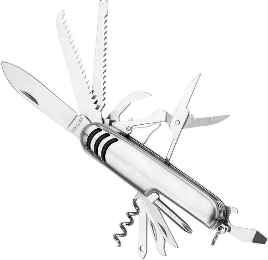 Scyzoryk uniwersalny w etui, Ellix. Wielofunkcyjny, 13-elementowy nóż uniwersalny z ostrzami ze stali nierdzewnej. Oprócz standardowych ostrzy posiada między innymi wkrętak z grotem krzyżowym i z grotem płaskim, dwa rodzaje mini piły, pilnik, korkociąg, otwieracz do butelek i do konserw oraz nożyczki. Wyposażony jest w uchwyt do zamontowania łańcuszka czy taśmy, zabezpieczającej przed zgubieniem.