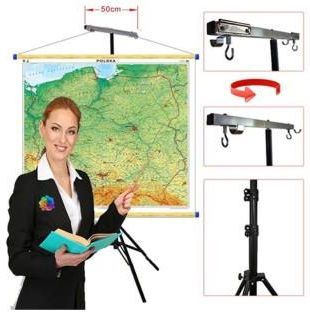 Na tym stojaku, po obydwu stronach belki zawieszającej, zaprezentujesz wszystko poczynając od zwykłej kartki papieru z zeszytu a na wielkoformatowej mapie kończąc...nawet jeśli ta ostatnia będzie miała urwaną linką zawieszającą ! Wielofunkcyjność stojaka bierze się stąd, iż na belce poziomej zamontowane zostały równocześnie aż trzy pary specjalnie wyprofilowanych elementów zawieszających pozwalających wyeksponować praktycznie każdą planszę lub mapę o dowolnie rozwiązanym systemie zawieszeń. Silne klamry planszowe służą do zawieszanie kart papieru, bristolu plansz kartonowych itp. nie posiadających żadnych zawieszek Profile półotwarte /haki pionowe/ służą do rozstawnego zawieszania plansz i map zaopatrzonych w małe zawieszki druciane lub plastikowe czy plansz kartonowych dziurkowanych, bądź do równoległego zawieszania plansz i map wielkoformatowych zaopatrzonych w linki zawieszające Profile łyżeczkowate /haki poziome/ służą zarówno do zawieszania wielkoformatowych map i plansz dydaktycznych - z reguły ciężkich - nawet tych pozbawionych linki zawieszającej a także do eksponowania konstrukcji przestrzennych, np., szkieletów brył, ram itp. Blisko 50 cm rozstaw elementów zawieszających gwarantuje, że prezentowane plansze nie będą się okręcać wokół osi stojaka w wyniku ruchu powietrza spowodowanego np. przejściem osoby czy drobnym przeciągiem. Parametry techniczne: wysokość maksymalna - 295 cm. wysokość minimalna - 110 cm. długość po złożeniu - 98 cm. ilość sekcji składanych - 3 udźwig - 6 kg. Płynna regulacja rozstawu nóg W położeniu optymalnym dodatkowa stabilizacja "czwarta noga" Stojak produkujemy na bazie elementów z których wykonywane są profesjonalne trójnogi do ekranów projekcyjnych, zatem cechuje go solidność, estetyka wykonania oraz dbałość o szczegóły a zastosowanie amortyzujących sprężyn, w każdym segmencie, pozwoliło połączyć stabilność i wytrzymałość z mobilnością poręcznej i lekkiej konstrukcji. Stojak dostarczany jest w stanie złożonym i praktycznie zmontowanym. Pomoce dydaktyczne: Waga produktu: ok. 2,3 kg