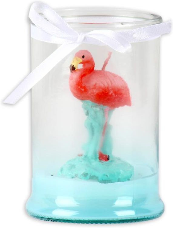 - świeczka dekoracyjna z limitowanej kolekcji Colors of Paradise - kształtem przypomina flaminga - umieszczona w szklanym słoju przewiązanym tasiemką - ciekawy pomysł na prezent