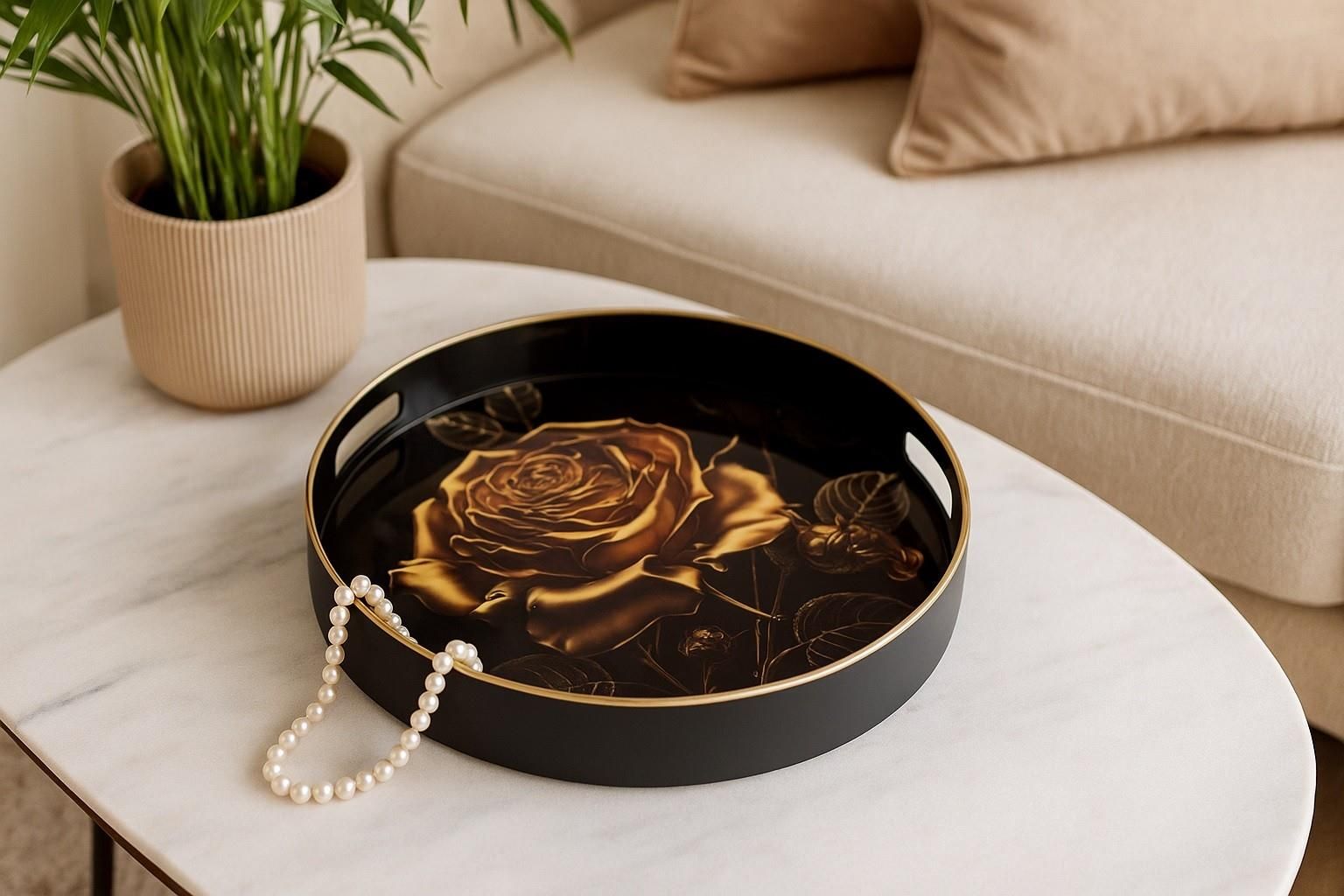 Okrągła taca dekoracyjna z złotej róży, Art-Pol Nowoczesna taca okrągła z motywem róży – styl, który zachwyca! Wnieś do swojego wnętrza nutę egzotyki i elegancji dzięki designerskiej tacy marki Art-Pol. Ten modny dodatek w formie okrągłej tacy z wysokim rantem i dekoracyjnym nadrukiem róży w odcieniach złota i żółtego, to nie tylko funkcjonalny przedmiot, ale również stylowy akcent dekoracyjny zgodny z trendem urban jungle i botanicznych inspiracji. Najważniejsze cechy produktu: Nowoczesny design z nadrukiem róży – zgodny z trendami wnętrzarskimi. Wysokie obrzeże – zapewnia bezpieczeństwo i stabilność serwowanych elementów. Wykonanie z tworzywa sztucznego – lekkie, trwałe i łatwe do utrzymania w czystości. Dostępna w dwóch rozmiarach: Mniejsza: 35 cm Duża: 37 cm (drugi wariant znajdziesz w osobnej ofercie) Taca śniadaniowa – serwuj kawę, napoje, przekąski w eleganckim stylu. Dekoracja stolika kawowego lub komody – wyeksponuj świece, wazony, figurki lub rośliny doniczkowe. Organizer na kosmetyki lub perfumy – do łazienki, toaletki lub sypialni. Podkład dekoracyjny pod zestawy świec, kadzidełka lub drobiazgi w stylu boho lub glamour. Do kuchni i jadalni – jako estetyczna i praktyczna taca serwisowa. Produkt idealnie odnajduje się w stylu: Urban jungle Nowoczesnym glamour Tropikalnym / botanicznym Boho chic Art déco z nutą egzotyki To must-have wśród dodatków wnętrzarskich sezonu – funkcjonalność połączona z modnym wzornictwem.