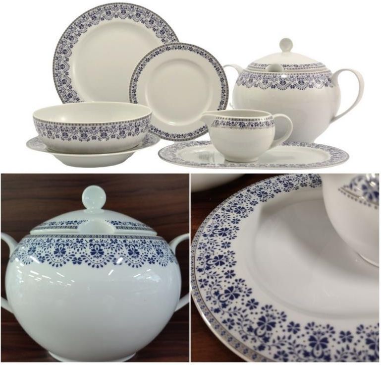 Serwis obiadowy WA-160 Kobalt to klasyczna porcelana w eleganckim wydaniu, wzbogacona dekoracją inspirowaną tradycyjnym kobaltowym zdobnictwem. Delikatny, misterny ornament w odcieniach granatu otula brzegi naczyń, tworząc wyrazisty, ale wciąż subtelny akcent stylistyczny. Kompozycja wzoru przywodzi na myśl ręcznie malowane motywy, dzięki czemu serwis zyskuje szlachetny, ponadczasowy charakter. Głęboka biel porcelany w połączeniu z chłodnym kobaltem sprawia, że serwis świetnie prezentuje się zarówno w codziennych aranżacjach, jak i podczas uroczystych spotkań przy stole. To idealny wybór dla osób, które cenią elegancję, precyzję wykonania i tradycyjne wzornictwo w nowoczesnym ujęciu. Skład zestawu: talerz płytki 26 cm x 12 szt. talerz głęboki 22,5 cm x 12 szt. talerz deserowy 19 cm x 12 szt. półmisek owalny 32 cm x 2 szt. salaterka 20 cm x 2 szt. sosjerka 300 ml x 1 szt. waza 2,7 l x 1 szt. Serwis WA-160 Kobalt to wyjątkowe połączenie klasyki i dekoracyjnej precyzji, które pozwoli stworzyć piękną oprawę każdego posiłku. Zdjęcie aranżacyjne ma charakter poglądowy. Prezentowana aranżacja może zawierać elementy dekoracyjne niewchodzące w skład zestawu. Szczegóły dotyczące zawartości znajdują się w opisie produktu. Produkt może być stosowany w zmywarkach, gdy spełnione są następujące wymogi: - stosować jedynie delikatne środki myjące - żele - stosować tylko programy do delikatnego mycia - naczynia w zmywarce układać luźno, by ich stykanie się w trakcie mycia nie powodowało zarysowań rantów - przed włożeniem do zmywarki nie stosować ostrych gąbek lub innych przedmiotów mogących spowodować zarysowania - przy myciu ręcznym lub wstępnym nie stosować past lub proszków o właściwościach ściernych - nie stosować środków żrących ani dezynfekujących Nie nadaje się do użytku w kuchenkach mikrofalowych
