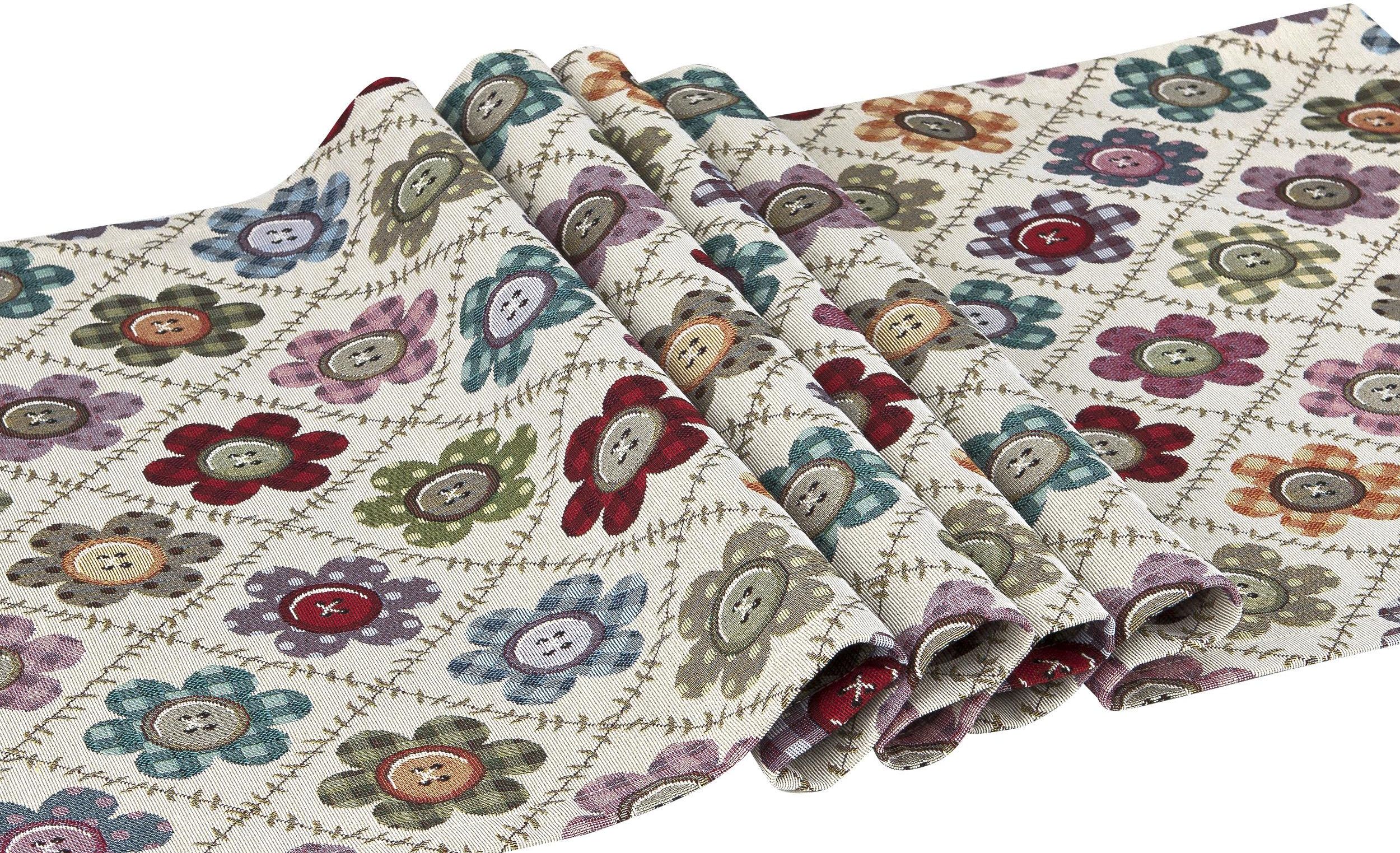 Bieżnik na stół 50x150 cm Eden 122 Elegancki bieżnik tkany z barwnym motywem symetrycznych kwiatów z guziczkami wewnątrz. Bardzo interesująco się prezentuje. Idealny na ławę, a także niewielki stół. Upiększy każdy domowy zakątek. Bieżnik jest gobelinowy. Skład: 75% poliester 22% bawełna 3% akryl …