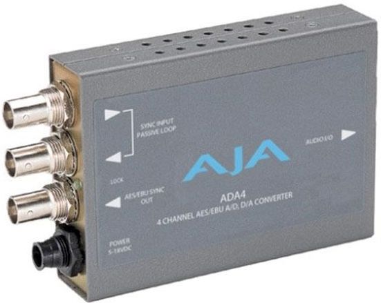 AJA ADA4 4-kanałowy, dwukierunkowy konwerter audio, który może być skonfigurowany jako: 4-kanałowy przetwornik A/C, 4-kanałowy C/A, 2-kanałowy A/C i 2-kanałowy C/A lub jako synchronizer AES. Konwerter ADA4 obsługuje wejście synchronizacyjne AES11, wordclock lub wideo sync/color black reference. Wejście reference oraz synchronizacja są automatyczne, natomiast poziomy audio konfigurowalne poprzez dipswitch. Dane techniczne: We/wy analogowego audio: zbalansowane, XLR, jeden kanał na złącze XLR We/wy AES audio: zbalansowane 110 ohm, XLR, 2 kanały na złącze XLR Poziomy audio analogowego: +24dBu (SMPTE RP155) +18dBu (EBU R68) +15dBu +12dBu (klienckie +10dBv) Konwersja audio: 24-bitowa, 48/96kHz Kontrola użytkownika: zewnętrzny dipswitch kanał 1/2: A/C, C/A kanał 3/4: A/C, C/A poziom audio 1 poziom audio 2 Pętla reference: 75 ohm (bez terminatora) HD/SD sync, AES-11 lub Wordclock (48/96kHz) Wymiary: 147 x 79 x 25mm Zasilanie: 5-18VDC, Pobór mocy: 3W Gwarancja: 5 letnia gwarancja producenta