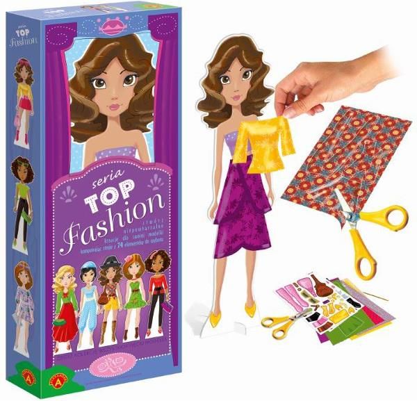 Top Fashion – Modelka 4 Kreatywne laleczki. Seria złożona z 5 osobnych modelek. Zabawa polega na samodzielnym wycinaniu oraz komponowaniu umieszczonych w opakowaniu ubiorów. Układane kreacje można łatwo mocować i zmieniać na modelce za pomocą taśmy dwustronnej. Możliwość ustawienia modelki w pionie, dzięki czemu można się nią bawić po wyklejeniu stroju. Zawartość opakowania 13 plansz do wycinania, 2 plansze z elementami samoprzylepnymi, postać modelki z tektury, taśma przylepna, 2 elementy stojaka, patyczek, instrukcja Nagrody Jak się bawić Wyjmij wszystkie elementy zabawki z pudełka i ułóż na stole. Wytnij wybrane stroje z szablonów według konturów umieszczonych na tylnej stronie. Skomponuj własną stylizację dla lalki i przymocuj ją za pomocą dwustronnej taśmy klejącej. Ozdób ją dołączonymi do zestawu naklejkami. Umocuj modelkę na stojaku w pozycji pionowej. Baw się laką tworząc scenki rodzajowe lub odklej stworzoną kreację i ubierz lalkę ponownie według własnej fantazji. Produkty