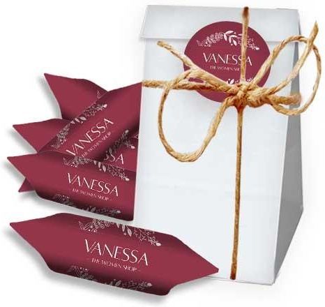 50 zestawów firmowych -250 sztuk krówek z LOGO , po 5 do torebki -50 papierowych torebek Pearl białe 8x19cm -50 x sznurek jutowy -50 naklejek z LOGO na woreczek -projekt Skład: cukier, syrop glukozowy z pszenicy, odtłuszczone mleko (12%), masło, śmietanka w proszku, tłuszcz roślinny, syrop …
