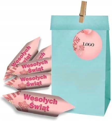 50 zestawów firmowych -250 sztuk krówek z LOGO , po 5 do torebki -50 papierowych torebek niebieskich 10x19cm -50 drewnianych klamerek do dekoracji i zamykania torebki -50 naklejek z LOGO na woreczek -dowolny projekt Skład: cukier, syrop glukozowy z pszenicy, odtłuszczone mleko (12%), masło, …