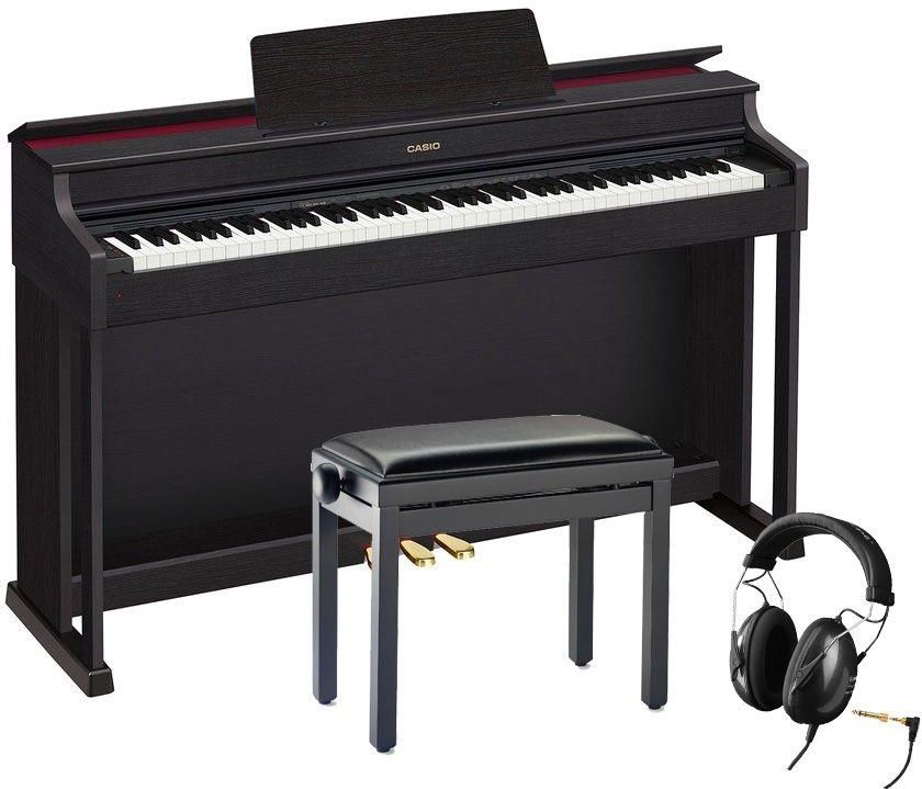 Zestaw: Casio AP-470 - pianino cyfrowe IMG Stage Line MD-5000DR - słuchawki dynamiczne Stagg PB-39 BK M S BK - ława do pianina KLASYCZNY WYGLĄD I NIESAMOWITE BRZMIENIENowy model AP-470 z serii Celviano oferuje nowe doznania z gry i całkowicie nowy wygląd. Wśród 22 brzmień znajdują się dwa nowe brzmienia fortepianowe. Usprawniony system głośników o mocy 40 W i otwierana klapa wierzchnia zapewniają imponujące i pełne brzmienie instrumentu. Dodatkowo za pomocą aplikacji „Chordana Play for Piano” można sterować funkcjami instrumentu przy użyciu smartfonu czy tabletu (potrzebne przewody i urządzenia zewnętrzne nie są częścią zestawu).Główne cechy: Wielowymiarowy moduł brzmieniowy AiR 22 brzmienia, w tym dwa nowe brzmienia fortepianów Trzyczujnikowa klawiatura drugiej generacji Łączność z aplikacją Chordana Play for Piano Metronom, transpozycja i funkcje strojenia Różne pozycje otwarcia klapy wierzchniej Dwudrożny system czterech głośników: 20 W + 20 W Funkcje podziału klawiatury, warstw i duetu Nagrywanie audio na USB (Audio Recording) Łatwo dostępne wejście USB na pendriv NAJWYŻSZEJ KLASY PIANINO Nowy model AP-470 posiada dwa różne brzmienia fortepianowe odpowiednie dla każdego nastroju. Moduł AiR zapewnia niesamowity realizm dzięki rezonansowi strun, który podkreśla harmoniczne zależności pomiędzy nietłumionymi strunami. Rezonans tłumików, odpowiedź młotków i symulator klapy dodają szczegółowych detali odzwierciedlając każdy niuans gry. WIRTUOZERSKA KLAWIATURA Trzyczujnikowa klawiatura AP-470 posiada klawisze wykończone syntetycznym hebanem i kością słoniową oddając autentyczne odczucie gry i pełną dynamikę ekspresji. Klawiatura pozwala na szybką repetycję, tak jak w instrumencie akustycznym, bez konieczności powracania klawisza do pozycji wyjściowej. AP-470 odtwarza także mechaniczne przydźwięki towarzyszące drewnianym klawiszom fortepianu zwiększając głębię doznań fortepianowych. INNOWACJE DLA NAUKI I GRY Funkcja Concert Play zawiera 10 nagrań audio pełnej orkiestry symfonicznej, z której można usunąć partię lewej lub prawej ręki fortepianu. Tryb Duet i dwa wyjścia słuchawkowe pozwalają ćwiczyć o każdym czasie, a rejestrator MIDI i audio pozwalają natychmiastowo uchwycić graną melodię. AP-470 posiada specjalny tryb słuchawkowy, który optymalizuje brzmienie stereofoniczne fortepianu dla wygody grającego. KLASYCZNY WYGLĄD, WSPÓŁCZESNA ŁĄCZNOŚĆ Potężny system głośników obudowany jest w elegancką obudowę dostępną w różnych wykończeniach. Otwierana klapa pozwala na dopasowanie dźwięku jak w instrumencie akustycznym, a zamykana osłona klawiatury chroni instrument gdy jest on nieużywany. Wyjście USB zapewnia bezproblemową łączność z komputerem PC, Mac oraz urządzeniami iOS i Android. Darmowe oprogramowanie Chordana Piano pozwala na zmianę ustawień instrumentu za pomocą telefonu czy tabletu. Możesz także zobaczyć nuty w formacie PDF i uczyć się swoich ulubionych utworów z plików MIDI za pomocą wertykalnego widoku dźwięków i systemu oceniania.Dane techniczne: Ilość klawiszy: 88 Rodzaj klawiatury: Tri-sensor Scaled Hammer Action Keyboard II Wykończenie klawiszy: Syntetyczny heban i kość słoniowa Czułość: 3 poziomy czułości, wył. Maksymalna polifonia: 256 Ilość wbudowanych brzmień: 22, wielowymiarowe morfowanie AiR Warstwy: Tak (Poza dźwiękami basowymi) Odpowiedź młotków: Tak Rezonans strun: Tak Rezonans tłumików: Tak Symulator klapy: Tak Symulator Key Off: Tak Przydźwięk tłumików: Tak Efekty cyfrowe: Symulator przestrzeni/Pogłos 4, Chorus 4, Brilliance (-3, 0, +3), DSP domyślnie dla niektórych brzmień Ilość wbudowanych rytmów: 180 Rytmy użytkownika: 10 Ilość wbudowanych utworów: 60 Otwierana klapa wierzchnia: Tak Funkcja lekcji: Wł./ wył. partii, Prawa ręka, lewa ręka Rejestrator MIDI: 2 ścieżki, 1 utwór Rejestrator audio/odtwarzacz: Max. 99 utworów, około 25 minut/utwór (format 44.1 kHz WAV) Tryb Duetu: Tak Metronom: Tak Pedały: 3 (Tłumiki, Soft, Sostenuto) Kontrola strojenia: A4 = 415.5Hz ~ 440.0Hz ~ 465.9Hz Wyświetlacz: Podświetlany LCD Wejście MIDI: Tak Wejście słuchawkowe: 2 (Standard jack stereo) Wyjście liniowe: 2 (L / MONO, R), Standard jack USB to device: Tak USB to host: Tak Wymiary: 1,417 x 427 x 861 mm (klapa zamknięta, bez pulpitu) Głośniki: Dwudrożny, 4 głośniki Waga: 43,4 kg Akcesoria opcjonalne: Zasilacz (AD-E24500LW), Pulpit, Wieszak słuchawkowy