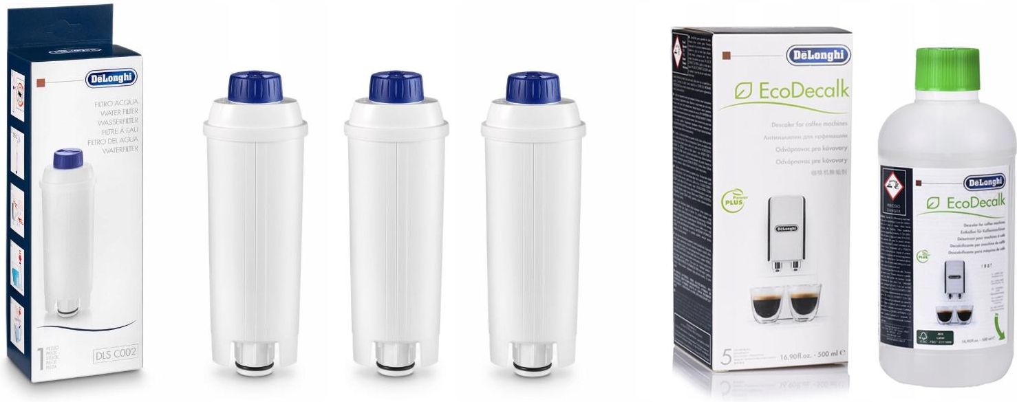 Przedmiotem sprzedaży jest : Zestaw przeznaczony do ekspresów renomowanej Włoskiej marki DeLonghi : Odkamieniacz w płynie przeznaczony do automatów i ekspresów kawowych a także półautomatycznych, kolbowych, czajników do wody a także zestaw filtrów, które są kompatybilne z tymi ekspresami. Zastosowanie : Odkamieniacze szybko usuwają resztki nieorganiczne i twarde osady bez powodowania korozji elementów wewnętrznych. Usuwają osad wapienny powstający w wyniku podgrzewania wody. Regularność odkamieniania oczywiście zależy od częstotliwości z jaką pracuje urządzenie.Stosowanie akcesoriów odkamieniających w znaczny sposób przyczynia się do poprawy smaku parzonej kawy. Regularne stosowanie odkamieniacza zwiększa żywotność i wydajność ekspresu. Ponad formuła EcoDecalk jest całkowicie przyjazna środowisku. Wkłady filtrujące ( filtry wody ) przeznaczone do ekspresów zapobiega powstawaniu osadu wapiennego. Dzięki swoim właściwościom chronią urządzenie i przedłużają jego trwałość. Gwarancja, że woda służąca do przygotowywania kawy jest świeżo przefiltrowana, tuż przed zaparzeniem kawy. Świeżo przefiltrowana woda jest pozbawiona złych aromatów, powoduje odkrycie na podniebieniu zupełnie nowych smaków i zapachów kawy, ponadto filtr ten usuwa chlor wody kranowej. W skład zestawu wchodzi : 1 sztuka odkamieniacza w płynie ( 500 ml ) - marki DeLonghi 3 wkłady filtrujące ( filtry wody ) - marki DeLonghi Dane techniczne : Kody alternatywne : SER3017 / DLSC002 / 5513292811 Okres użytkowania : 5 procesów odkamieniających ( odkamieniacz ) 50 L lub 2 miesiące ( wkłady filtrujące ) Pojemność : 500 ml Kraj produkcji : Włochy Producent : DeLonghi Lista kompatybilności : Odkamieniacz EcoDecalck wraz z filtrami pasują do niemalże wszystkich ekspresów marki DeLonghi : DeLonghi ™: EC800 Series, EC850M, EC820B, EC860M ECAM Series ECAM21110SB, ECAM21110W, ECAM21210B, ECAM21210W, ECAM22110B, ECAM22110B, ECAM22110SB, ECAM22110SB, ECAM22110SB, ECAM23210B, ECAM23210SB, ECAM23210W, ECAM23240B, ECAM23420SB, ECAM23420SBL, ECAM23420SR, ECAM23420ST, ECAM23420SW, ECAM23450B, ECAM23450B EX, ECAM23450S, ECAM23450S EX3, ECAM23450SL, ECAM26455M, ECAM25462S, ECAM25462B, ECAM25462S, ECAM24450S, ECAM24210SB, ECAM23450SEX3, ECAM23450S, ECAM23450BEX3, ECAM23450B, ECAM23440SB, ECAM23427R, ECAM23420SBSW, ECAM23240B, ECAM23210W, ECAM23120SB, ECAM23120BSB, ECAM21117B, ECAM21110B, ECAM23450 SL, ECAM65075MS, ECAM65055MS, ECAM28465M, ECAM28465MB, ECAM45760W, ECAM23460B, ECAM23460S, ECAM44660B, ECAM44620S, ECAM25452B, ECAM22360B, ECAM22360S SECAM Series SECAM26455BLBBM, SECAM22110SB, SECAM21117BSB, SECAM21110BSB, SECAM22110B ETAM Series ETAM36365M, ETAM36365MB, ETAM29660SB, ETAM29510SB, ETAM29510B, ETAM29620SB ESAM Series ESAM6900, ESAM6900M, ESAM69, ESAM6750, ESAM6700, ESAM67, ESAM6650, ESAM6620, ESAM6600, ESAM66, ESAM4200S, ESAM4500, ESAM4400, ESAM3400, ESAM2600 EX1, ESAM2200 EX1, ESAM 5450 EX1, ESAM 5400 EX1, ESAM 5600 S, ESAM 5500 T, ESAM04320S, ESAM04110S, ESAM04110B, ESAM03120S, ESAM03110S, ESAM3000B