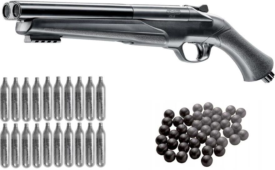 Prezentujemy najmocniejszą na rynku i dostępną bez zezwolenia, strzelbę obronną Umarex HDS 68 T4E lupara kal. .68 cala. Don Corleone w filmie "Ojciec Chrzestny" powtarzał, że rodzina i przyjaciele to najcenniejszy dar. Jeśli chcesz chronić swoją rodzinę i najbliższych przed złem, które pojawia się nagle i zakłóca Twój spokój, musisz mieć odpowiednie narzędzia do obrony. Strzelba zaprojektowana w Niemczech i zaprezentowana po raz pierwszy na targach IWA w 2019 roku charakteryzuje się rozwiązaniami niedostępnymi w innych konstrukcjach. Nowoczesny system zasilania oparty na technologi Emergency System i dwie lufy sprawiają, że każda kula o kalibrze .68 cala, dosięgnie celu. Dzięki temu możesz skutecznie trenować swe umiejętności, a w sytuacji zagrożenia bez problemu obronisz się przed zagrożeniem. Tym, co wyróżnia strzelbę lupara T4E HDS .68 spośród innych konstrukcji tego typu, są dwie potężne lufy. Wraz z wydajnym systemem zasilania, generują one moc dochodzącą do 16 J.  Warto zaznaczyć, że oferowana wersja jest niemal dwukrotnie mocniejsza niż modele sprzedawane na rynku niemieckim. Dzięki olbrzymiej mocy postrzał jest odczuwalny przez nawet bardzo grube ubranie, a przez to praktycznie nie istnieje możliwość ochrony przed postrzałem bez wykorzystania tarcz lub osłon. Dwie lufy bez bruzd, pozwalają oddawać strzały w kilku trybach. Dzięki specjalnemu systemowi możesz wybrać czy strzelasz z lewej czy z prawej lufy. Co więcej, w razie potrzeby możesz oddać strzał z dwóch luf naraz. W sytuacji zagrożenia liczy się szybka reakcja. Solidna polimerowa konstrukcja strzelby lupara T4E HDS 68, nawiązuje swym kształtem do klasycznych strzelb znanych z kinowych produkcji. Waga nie przekraczająca 1700 g, pozwala na łatwe manipulowanie i bezproblemową obsługę. Znakomicie wyprofilowana rękojeść ma chropowatą powierzchnię, która ogranicza ryzyko wytrącenia z dłoni. Wszystko to daje możliwość łatwego przenoszenia jej pod kurtką lub bluzą. Umieszczony na spodzie przełącznik pozwala zwolnić blokadę i odchylić obie lufy. Ich konstrukcja umożliwia bezpośrednie ładowanie dwóch, różnych rodzajów kul o kalibrze .68 cala. Dzięki temu, możesz strzelać do napastnika kulami gumowymi i pieprzowymi w tym samym czasie. Napęd, nowoczesnej strzelby T4E HDS 68 został oparty o sprężony dwutlenek węgla. Kapsuły o wadzę 12 gramów montowane są w rękojeści, co ułatwia dostęp do nich. Nowoczesna konstrukcja i opatentowana technologia Emergency System sprawia, że pełna kapsuła ze sprężonym gazem, umieszczona w komorze może być bezpiecznie przechowywana przez długi czas. Dopiero w sytuacji zagrożenia, dociśnięcie nakrętki znajdującej się w dolnej części rękojeści przebija kapsułę uwalniając gaz. Powoduje to aktywacje wskaźnika przebicia naboju CO2 umieszczonego w tylnej części broni. System szybkiego przebicia kapsuły sprawia, że Twoja strzelba jest gotowa do działania w każdej chwili przez co możesz przechowywać ją w domu lub samochodzie. Producent strzelby Umarex HDS 68 chciał, aby była ona jak najbardziej wszechstronna i prosta w obsłudze. Właśnie dlatego, zdecydowano o umieszczeniu w dolnej części łoża, uniwersalnej szyny montażowej. Pozwala to na zainstalowanie opcjonalnej latarki taktycznej lub celownika laserowego. Za bezpieczeństwo odpowiada, bezpiecznik spustowy zapobiegający przypadkowemu wystrzałowi broni. Chroni on niedoświadczonego strzelca przed oddaniem niechcianego strzału, jednocześnie nie utrudniając normalnego użytkowania. Kapsuły CO2 firmy Umarex, które nadają się do zasilania strzelby HDS 68, pozwolą Ci oddawać silne strzały, dzięki wysokiemu ciśnieniu panującemu wewnątrz. Wykonanie ich ze stali nierdzewnej zapewnia czystość gazu i wysoką jakość. Opakowanie zawiera 20 kapsuł o wadze 12 gramów. W zestawie ze strzelbą HDS 68 T4E znajdują się również uniwersalne kule gumowe firmy Umarex. Wykonano je z należytą dokładnością przez co idealnie pasują do pistoletów i strzelb RAM. Dzięki kalibrowi wynoszącemu .68 cala tor lotu jest stabilny i pewny. Opakowanie zawiera 50 sztuk kul gumowych.