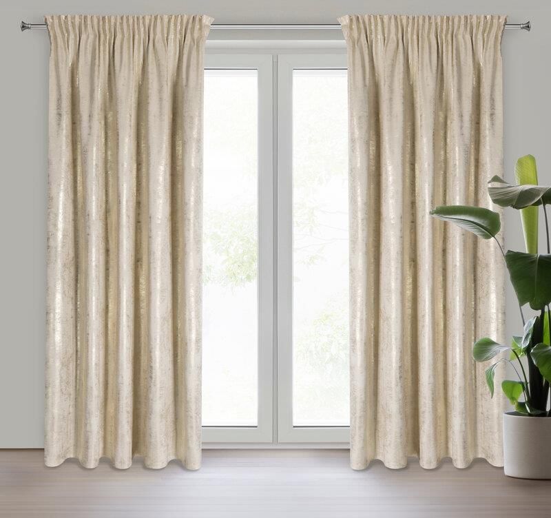 Zasłona RENIA z welwetu z przecieranym wzorem - Oryginalny produkt Eurofirany Najważniejsze cechy zasłony Elegancki, przecierany nadruk z delikatnym połyskiem Miękka welwetowa tkanina o luksusowym wyglądzie Gruba, puszysta i dobrze kryjąca materiał Praktyczna taśma marszcząca umożliwia estetyczne ułożenie Zasłona idealna do wnętrz glamour, nowoczesnych i eleganckich Nie kurczy się i nie wymaga prasowania przy prawidłowej konserwacji Opis produktu Podkreśl szyk nowoczesnego wnętrza welwetowymi zasłonami z blaskiem! Zasłona RENIA z nowoczesnym przecieranym nadrukiem na miękkiej welwetowej tkaninie dodaje wnętrzu elegancji i stylu. Tkanina o gęstym splocie i gramaturze 200 g/m² skutecznie osłania wnętrze przed nadmiarem światła, zapewniając poczucie prywatności oraz przytulną atmosferę. Elegancka dekoracja, wykonana z wysokiej jakości welwetu, zachwyca miękkością i subtelnym połyskiem. Przecierany wzór dodaje całości unikalnego charakteru, podkreślając nowoczesny i luksusowy styl zasłony. Praktyczna taśma marszcząca pozwala na łatwe zawieszenie zasłony i uformowanie symetrycznych fałd, co dodaje lekkości i elegancji całej dekoracji. RENIA doskonale prezentuje się w salonach, sypialniach, gabinetach i innych przestrzeniach, gdzie liczy się zarówno estetyka, jak i funkcjonalność. Jeśli zastosujesz się do zaleceń konserwacyjnych, tkanina nie będzie się kurczyć i nie będzie wymagała pracochłonnego prasowania. Uwaga: Przed zmarszczeniem zasłony na taśmie marszczącej, należy zawiązać sznurki na jej końcach w supeł, aby zabezpieczyć je przed wyciągnięciem. Parametry Kolor: jasny beż+szampański Szerokość: 140 cm Wysokość: 270 cm Stopień zaciemnienia: Średnie Skład: 100% poliester Gramatura: 200 g/m2 Szerokość taśmy marszczącej: 8 cm Wysokość wypustki nad taśmą: 3 cm Tolerancja rozmiaru: +/- 3 cm Ważne informacje Cena dotyczy jednej sztuki Wymiary podane na płasko, przed umarszczeniem Tolerancja wymiarów: +/- 3 cm Kolory mogą różnić się w zależności od ustawień ekranu