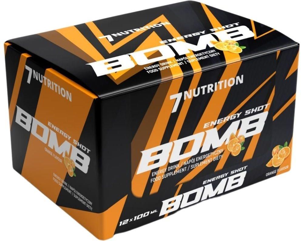 7Nutrition BOMB to suplement diety w płynnej postaci, w wygodnej formie shota z kofeiną. BOMB to połączenie 4 składników energetycznych: kofeiny, beta-alaniny, tauryny oraz jabłczanu cytruliny. Przeznaczony dla osób dorosłych, o zwiększonej aktywności fizycznej, szukających źródła dodatkowej energii. Skład: Wielkość opakowania: 12 x 100 ml Porcja jednorazowa: 25 ml Ilość porcji w opakowaniu: 48 Składniki25 mlRWSBeta-alanina800 mgJabłczan cytruliny334 mgTauryna334 mgKofeina133 mgGlukuronolakton84 mg RWS - Dzienna referencyjna wartość spożycia Nie ustalono dziennej referencyjnej wartości spożycia Składniki: Woda, beta-alanina; jabłczan cytruliny; tauryna; kofeina; kwas: kwas cytrynowy; glukuronolakton; aromat; substancje słodzące: sukraloza, acesulfam K; substancje konserwujące: benzoesan sodu, sorbinian potasu. Sposób użycia: 1 porcja = 25 ml (1/4 butelki) przed lub w trakcie treningu. Zalecana porcja dzienna = 75 ml (3/4 butelki). Przeciwwskazania: Nadwrażliwość na którykolwiek ze składników preparatu. Nie zaleca się stosowania u dzieci, kobiet w ciąży i karmiących. Nie spożywać z innymi produktami będącymi źródłem kofeiny lub innych składników o podobnym działaniu. Zawiera kofeinę (532mg/100ml). Nie przekraczać spożycia 400 mg kofeiny dziennie ze wszystkich źródeł. Przechowywanie: Przechowywać w suchym i ciemnym miejscu, w temperaturze 0-25ºC, w sposób niedostępny dla małych dzieci. Po otwarciu przechowywać w lodówce i spożyć do 48h.