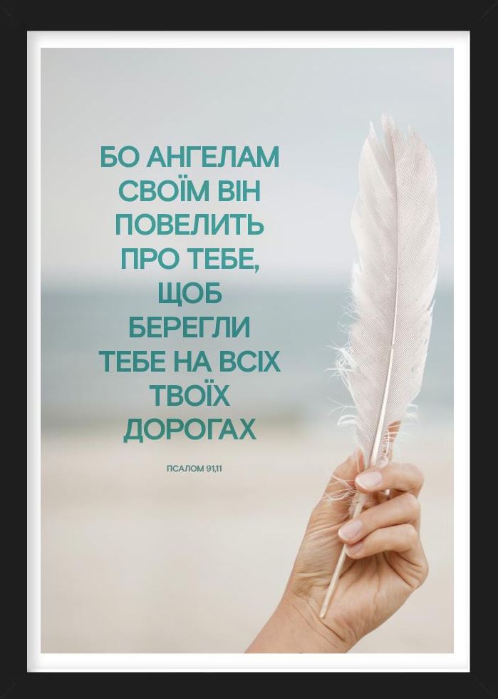 Plakat w ukraińskiej wersji językowej. Doskonały pomysł na prezent! Aniołom dał rozkaz o tobie, aby cię strzegli na wszystkich twych drogach. Ps 91,11 Wyjątkowy plakat z cytatem biblijnym w eleganckiej ramce w kolorze czarnym. Do zawieszenia na ścianie lub postawienia na biurku. Autorska grafika!